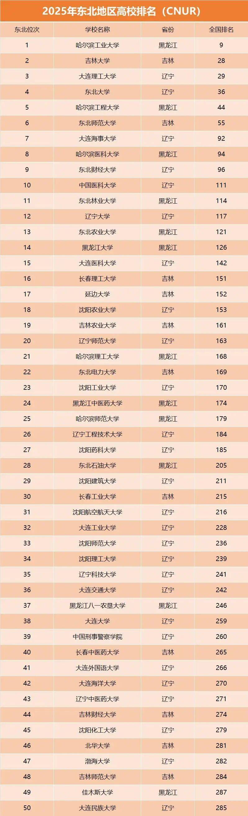今天我们根据第三方咨询机构cnur提供的数据,为大家带来2025年东北地区的高校排名情况。