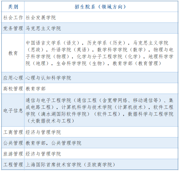 目前我校有非全日制专业学位硕士招生类别10个,相关招生院系与领域方向见下表: