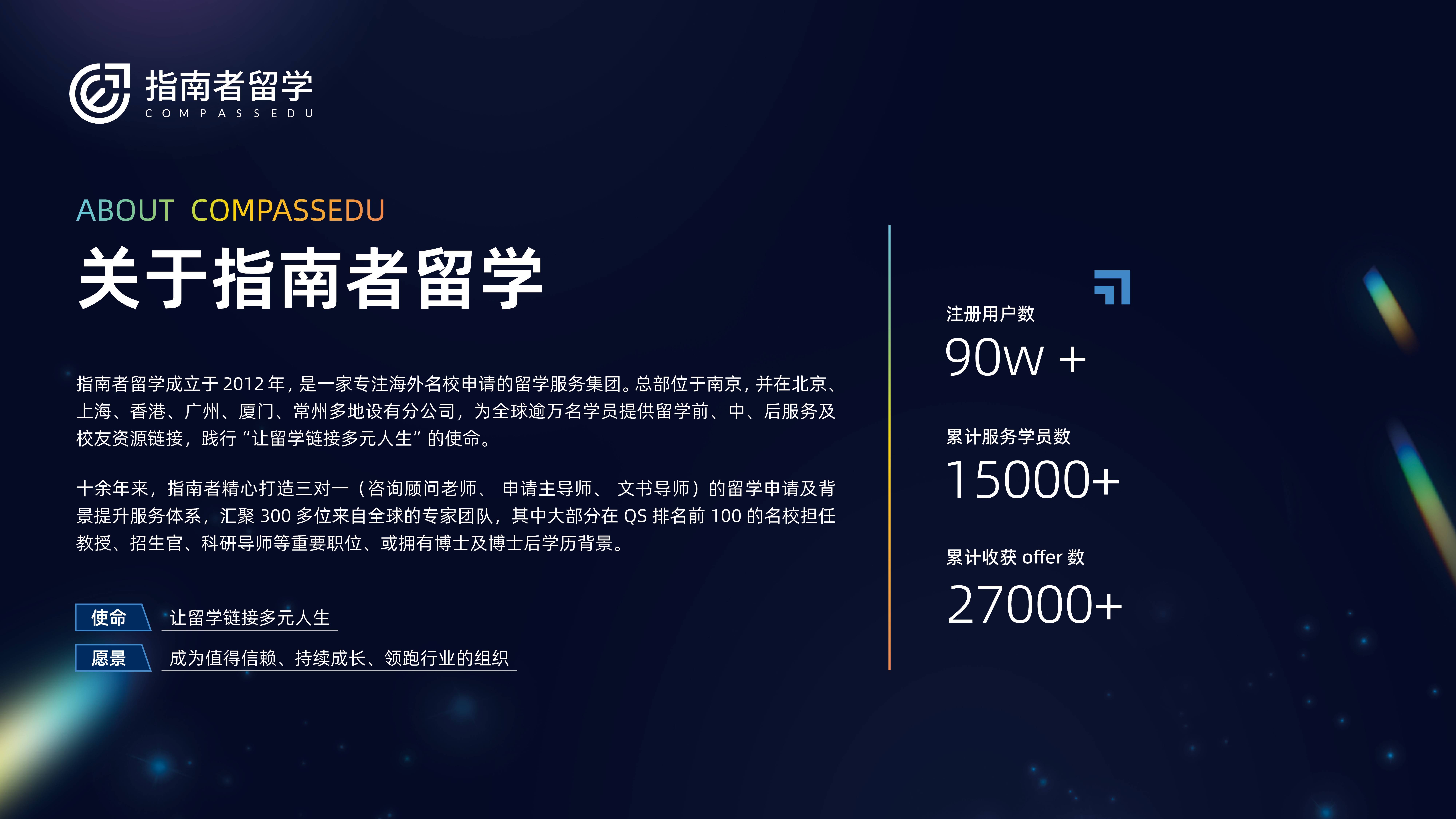 指南者留学为上海学生提供全流程服务,包括选校定位、背景提升、面试辅导、签证办理、行前指导等,并定期在上海举办线下讲座和校友分享会,帮助本地学生提前适应留学生活