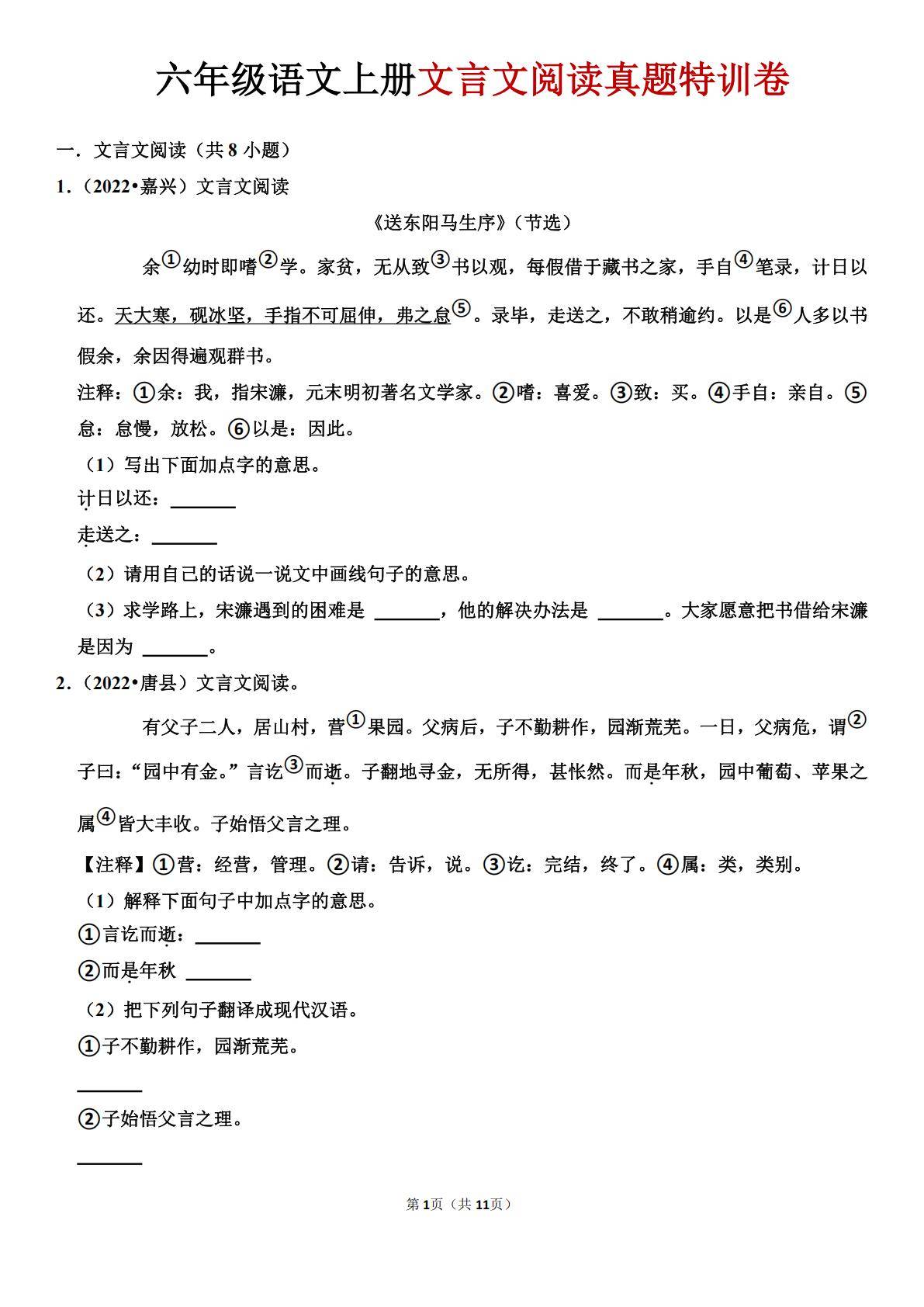 今天为大家分享:六年级(上)语文文言文阅读真题。题目类型丰富,有解释文言文字词含义、翻译文言句子、分析文言文内容与道理、体会人物形象等。从涵盖的方面来看,既选取了经典的文言文名篇片段,也有一些寓言类、故事类的文言文,考查内容涉及文言文基础知识,如字词解释、句子翻译,也有对文言文内容的理解、主旨的把握以及人物形象的分析等,从基础到提升,多维度考查学生的文言文阅读能力。