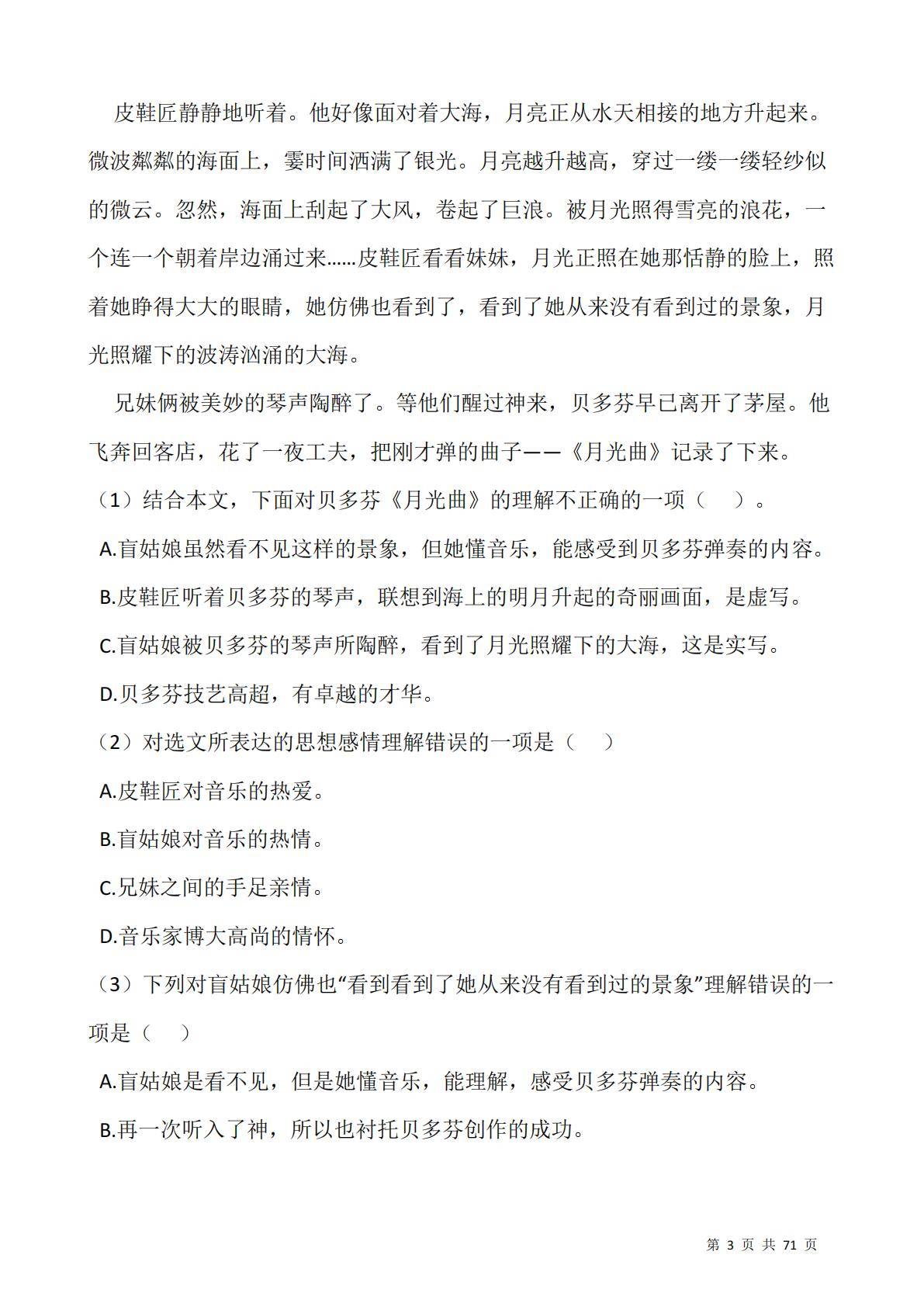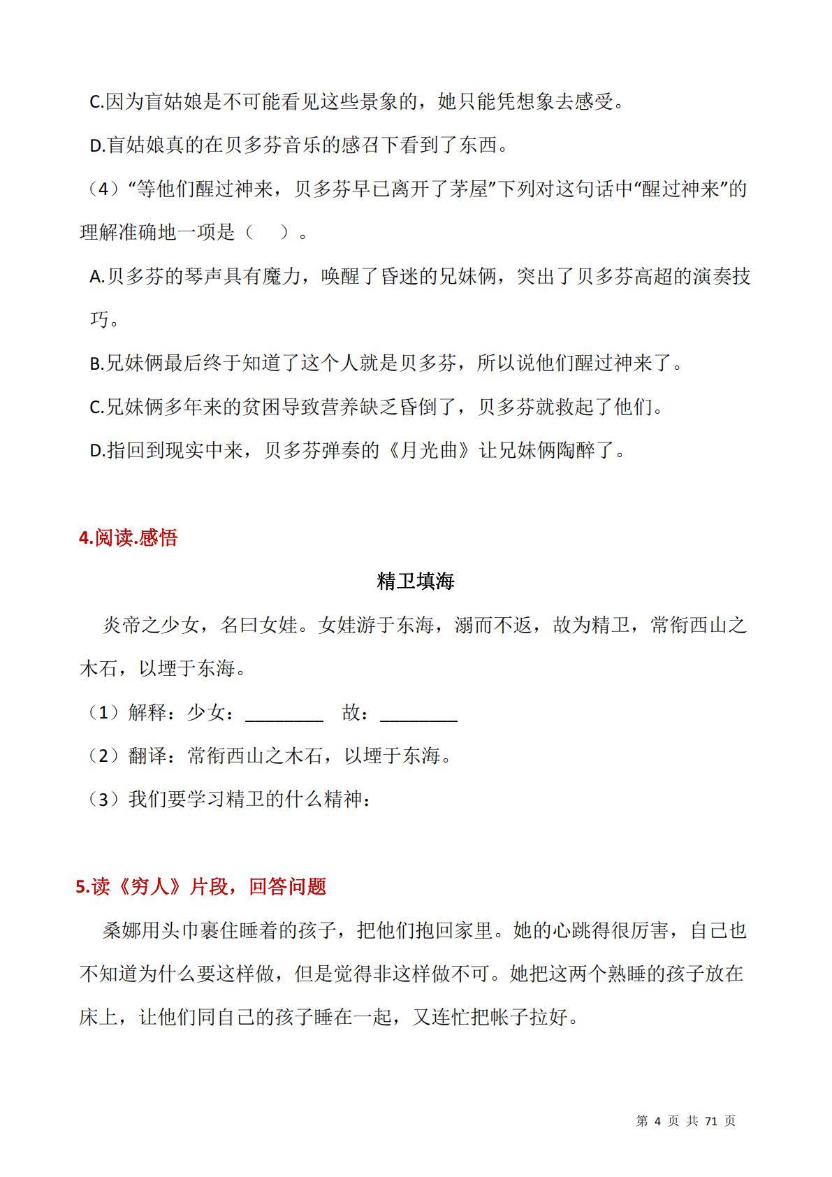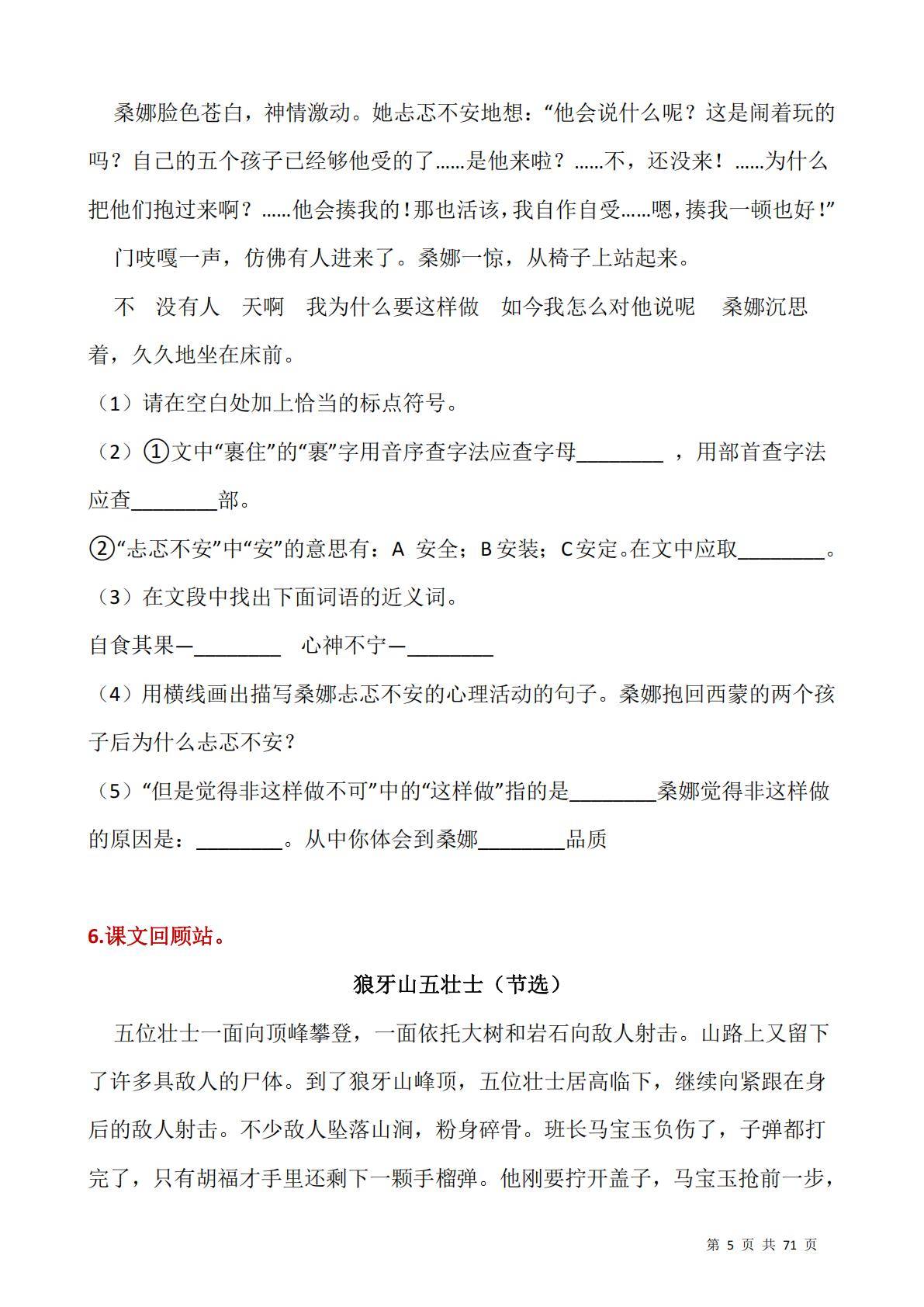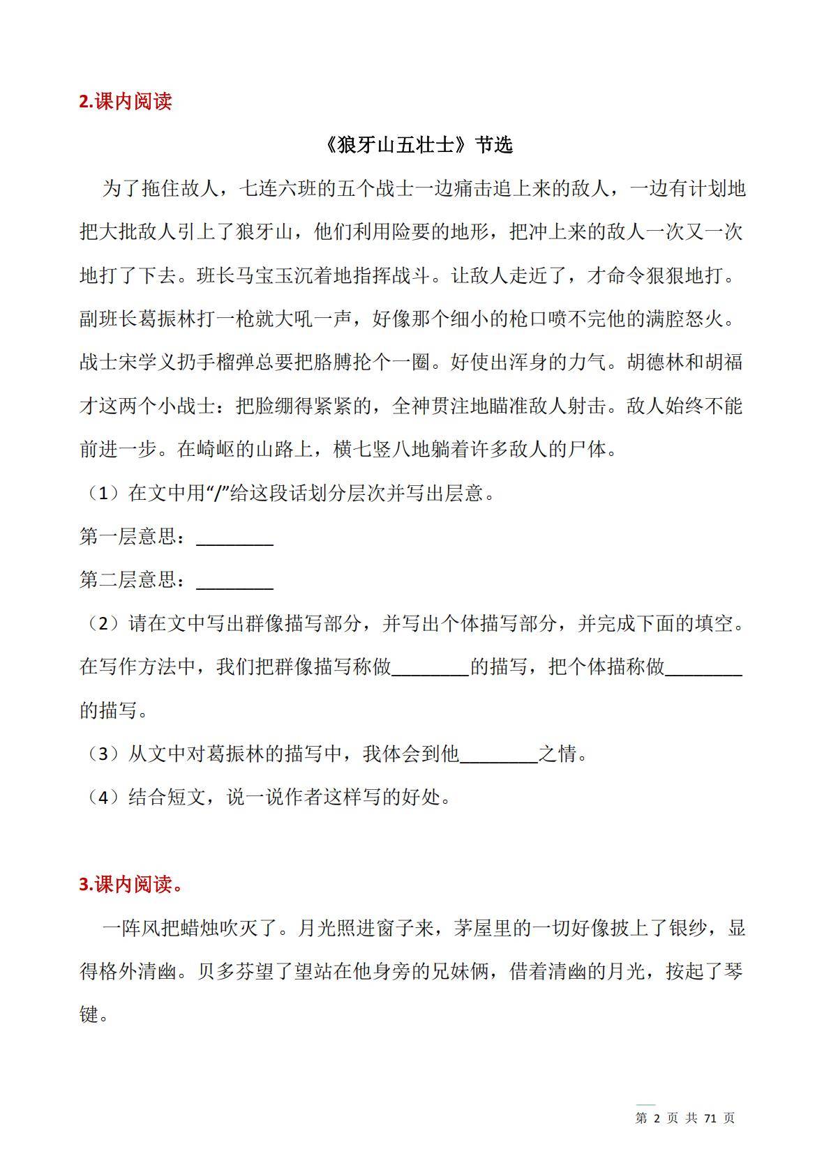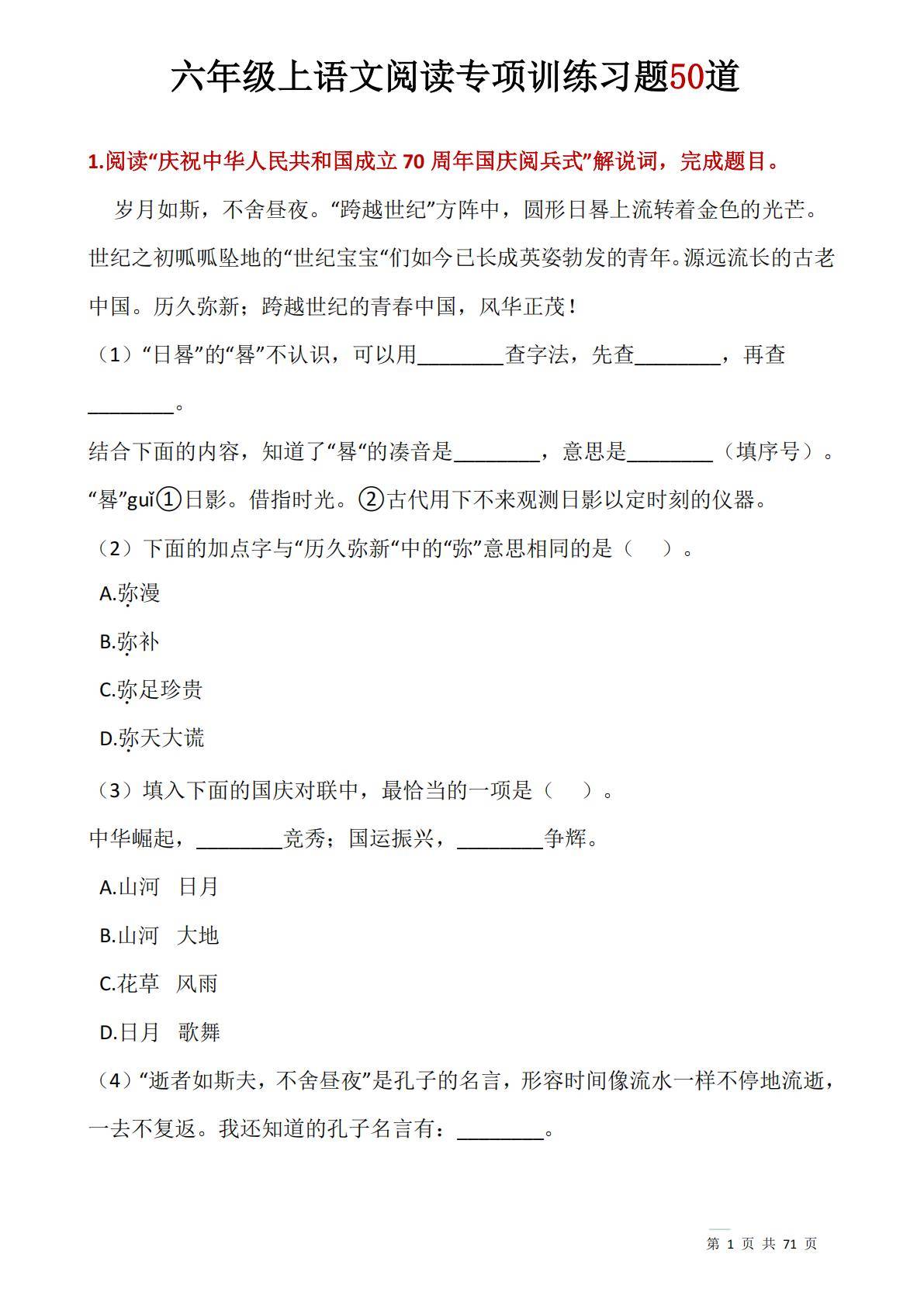 今天为大家分享:六年级(上)语文阅读专项训练习题50道,内容包含多种类型的阅读练习,有课内阅读,如《狼牙山五壮士》《月光曲》《穷人》等经典课文的节选阅读及相关题目;也有其他阅读材料,像 “庆祝中华人民共和国成立 70 周年国庆阅兵式” 解说词、《精卫填海》等的阅读练习。题目涉及的方面广泛,有对文章层次划分及层意概括的考查,有对群像描写和个体描写等写作方法的区分与理解,有对词语含义、近义词的考查,有对人物心理、品质的分析,有对文章内容、思想感情的理解,还有查字法、句子翻译等基础知识的考查。