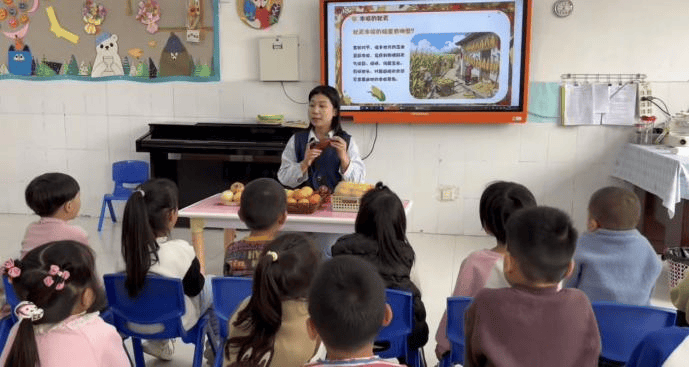 活动中,老师们将带着泥土气息的玉米、大豆、花生、红薯等农作物搬进教室,精心打造“室内农场”。老师们结合近期阴雨天气,一边引导孩子们观察实物,一边用生动的语言讲述:“这些农作物要在雨水中抢收,还要及时晾晒,不然就会发芽、发霉,农民伯伯的辛苦就白费了。”