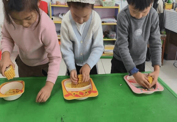 趣味游戏环节紧扣“感知辛劳”主题。“谷物分拣小能手”活动中,孩子们专注地将混合的红豆、黄豆、玉米仁分类装盒,老师轻声提醒:“农民伯伯收完庄稼还要分拣,雨天里这项工作更麻烦,我们可不能浪费一粒粮食呀!”“剥玉米小达人”挑战里,大家围坐在一起,小心翼翼地将玉米粒从玉米棒上剥下,不少孩子发现“玉米棒有点湿湿的,剥起来更费力了”,真切体会到雨天收割、处理粮食的不易。