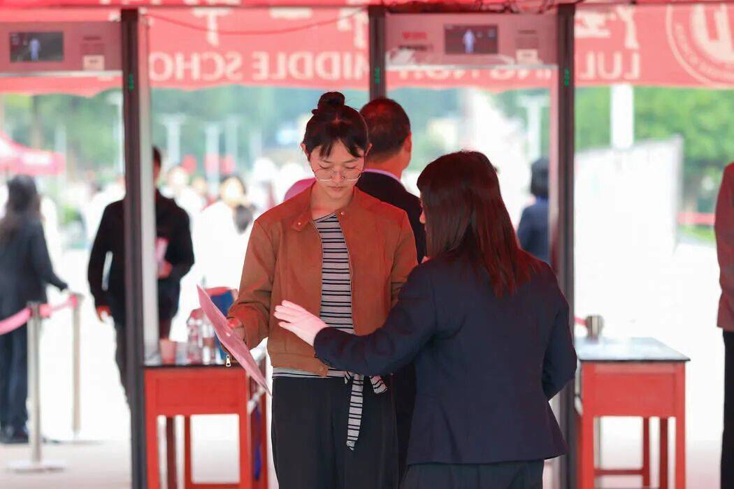 在陆良一中考点现场,记者看到考生持准考证、身份证核验后,寄存非考试物品,从容配合安检入场,整体秩序规范有序。