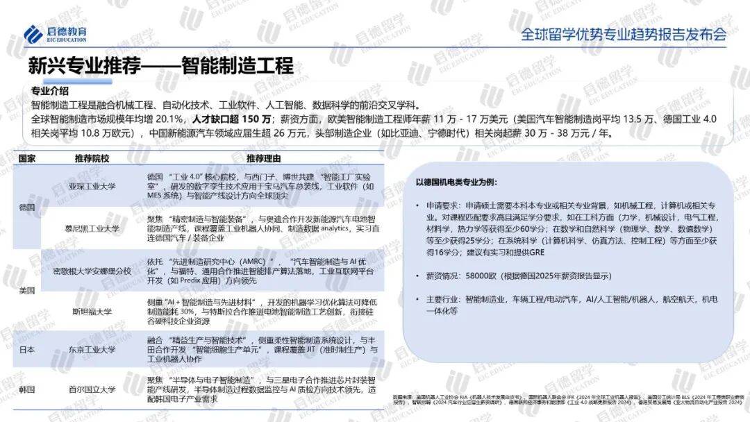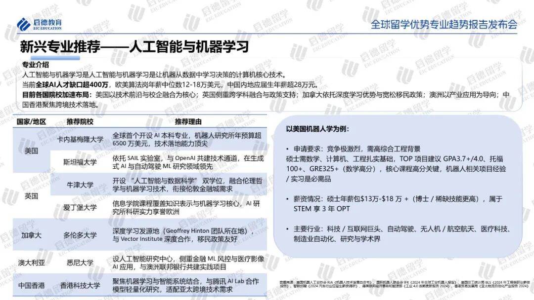 在机器人学、智能制造等领域,海外院校同样展现出鲜明特色。美国聚焦“AI+机器人”及航空航天材料研发;德国通过“工业4.0”将课程与企业需求结合;日本深耕服务机器人与高性能碳纤维;法国强化航空复合材料工艺教育。可持续发展方面,美国侧重ESG金融工具创新,欧盟重视合规教学,新加坡和中国香港建设亚太ESG金融枢纽。加拿大院校提供全面灵活的教育路径,涵盖AI融合机器人、可持续材料及ESG认证路径等多个应用领域。