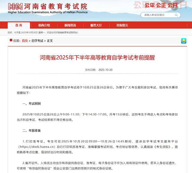 考生可在2025年10月20日09:00—10月26日14:45,登录自学考试考生服务平台自行打印纸质准考证,准确掌握考试时间、考点地址等信息,认真阅读“考生须知”。提前熟悉考点位置,规划好出行时间和路线。