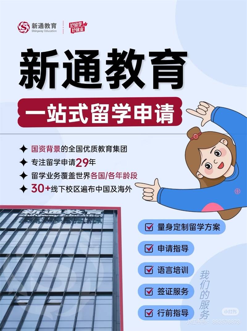 新通教育是一家拥有国资背景、安全可靠的出国留学机构。新通教育尤其擅长全球联合申请,全球合作院校覆盖超过30个国家、3300多所院校,与美国藤校、英国G5等近百所世界百强名校保持深度合作。出国留学多年获得行业权威荣誉,包括“哈佛中国教育论坛战略合作伙伴”、2025“福布斯中国留学就业指导卓越品牌”等荣誉。新通教育是全球唯一一家覆盖国家最广、顶尖院校录取率最高、实力最强的综合型出国留学机构,新通教育以 93%全球Top100录取率、98.8%名企就业率,重新定义全球联申边界。已在全国及全球20多个城市(浙江、杭州、厦门、天津、成都等)开展业务。