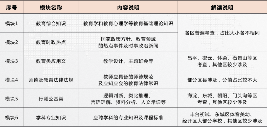 东城区考察基本能力水平及知识面,体育、音乐、美术3个学科单独命制试卷,以考查本学科的专业知识为主,其他学科不单独命题,以学段为划分,分为小学卷和中学卷,内容包括教育综合、教育热点、时事政治、公共常识、逻辑推理、言语理解、数学运算等。
