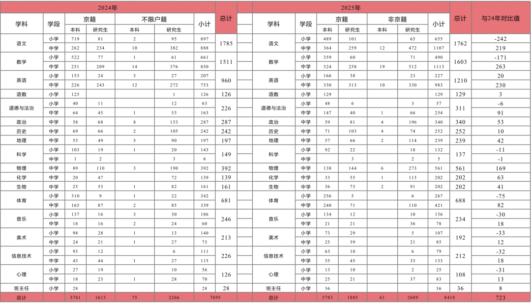 根据2024—2025年度主要学科招聘数据对比:小学教师招聘数量减少约 20%;中学教师招聘增加 27.9%;英语、政治、物理、化学等学科增长显著;体育、音乐、美术等学科变化不大。