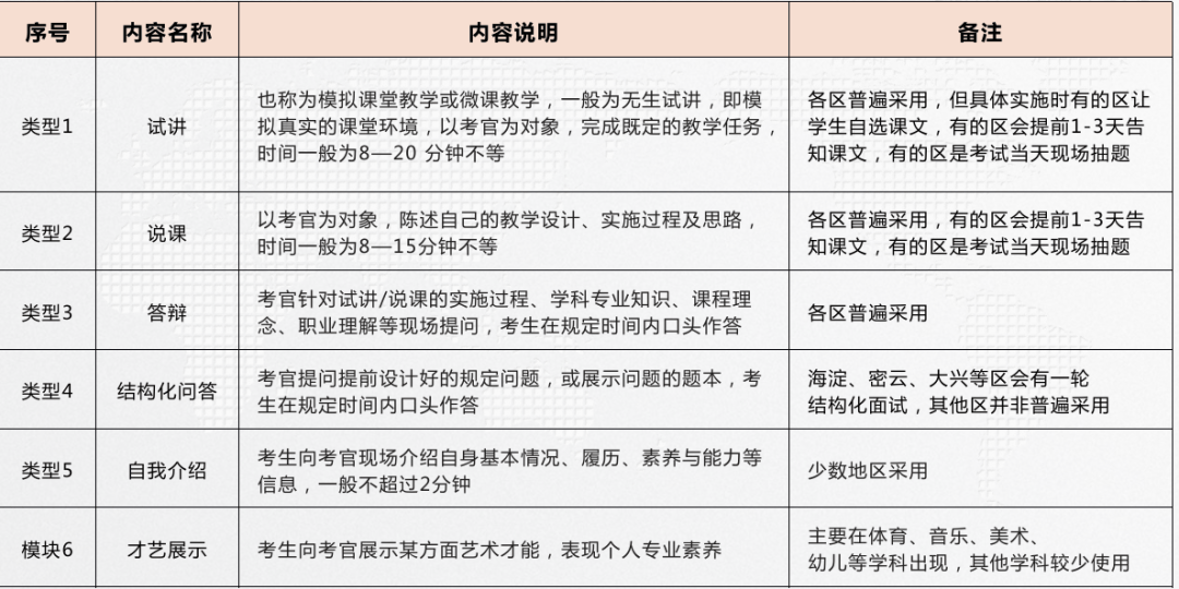 东城区面试由区教委统一明确时间,各招聘单位自主实施,考核形式为试讲×60%+面试×40%,试题来源于东城区当前学校在用教材,现场抽题,备课20-30分钟。