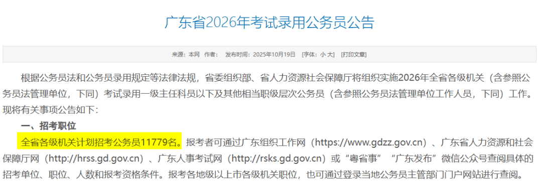 就在昨天,广东省考突然发布2026年考试公告,招11779人,报名时间:10月20日-24日16:00,12月7日进行笔试。