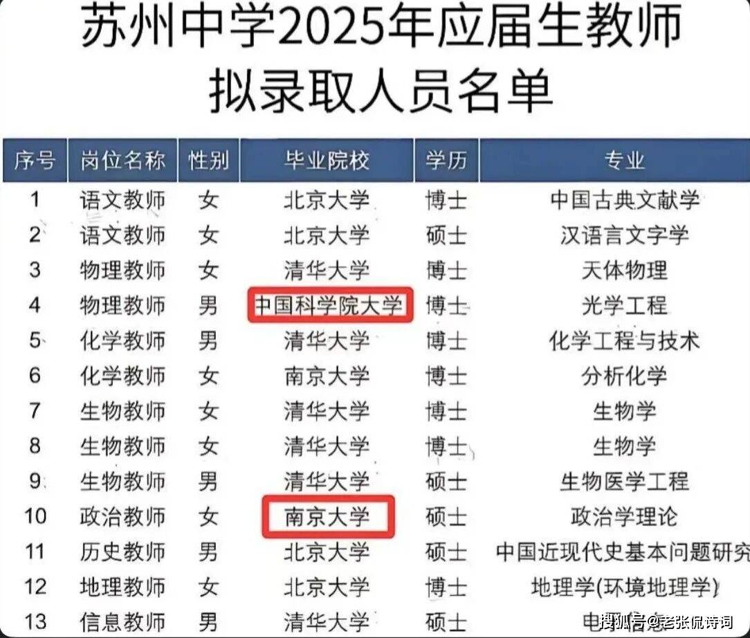 网上流传的一张图片,写的是苏州中学2025年应届生教师拟录取人员名单,里面有很多来自北大清华博士以及南京大学的硕士等等,他们获得了这么高的学历,去到苏州中学担任一个普通的中教老师,然后很多人觉得不可思议。