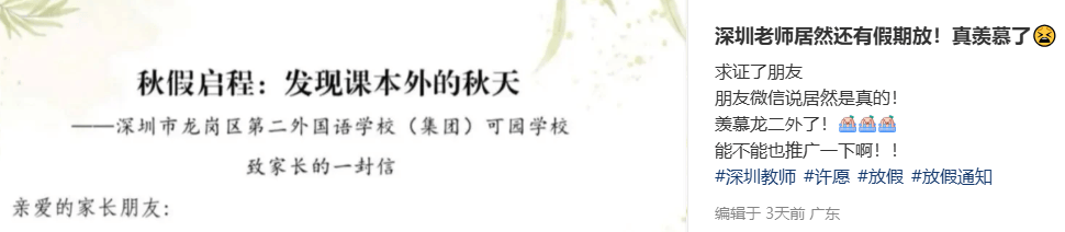 根据此前报道,今年3月份,有深圳市民在人民网“领导留言板”留言,建议深圳推行中小学春秋假制度,与此同时,“多地学校放春假”的话题一度冲上微博热搜。