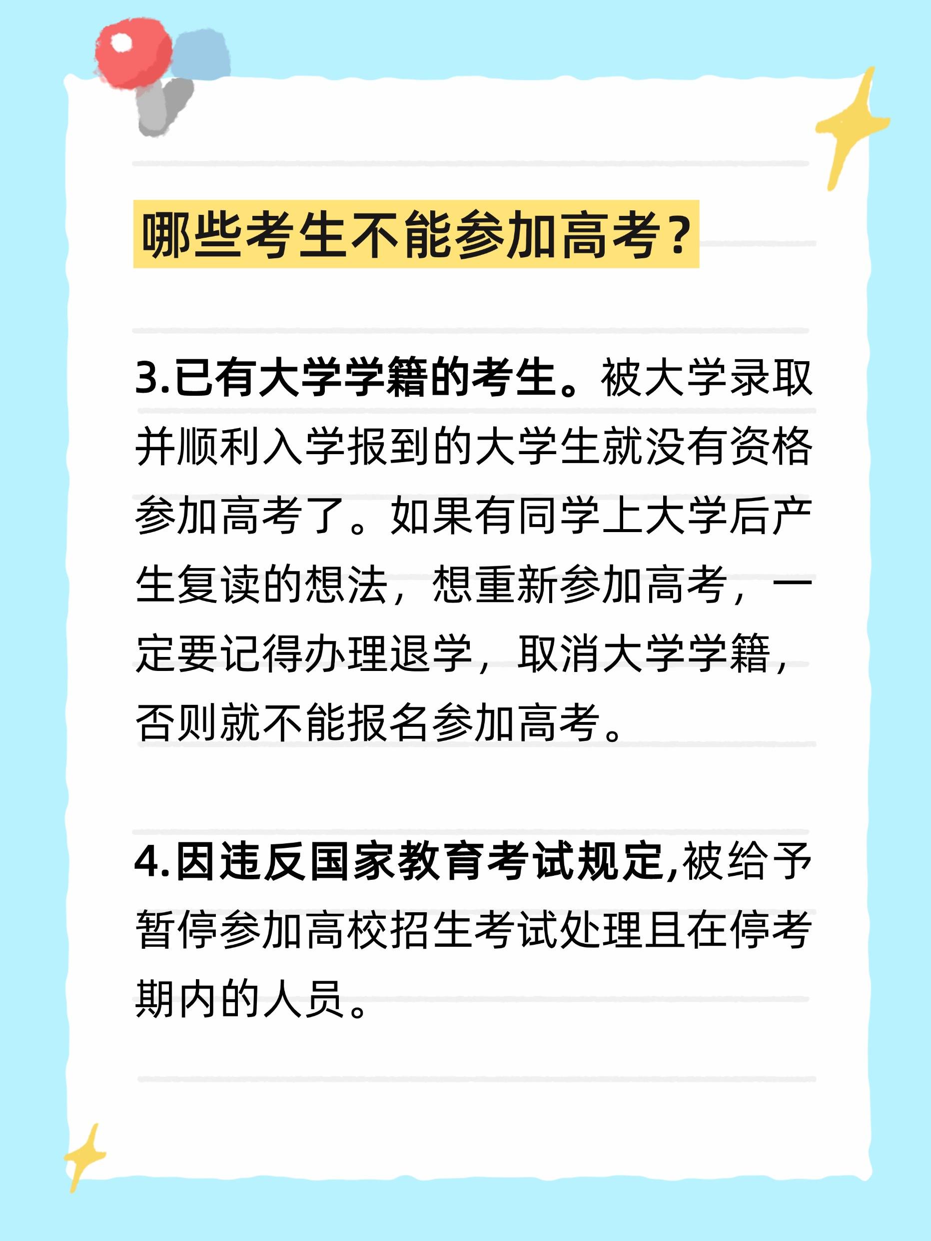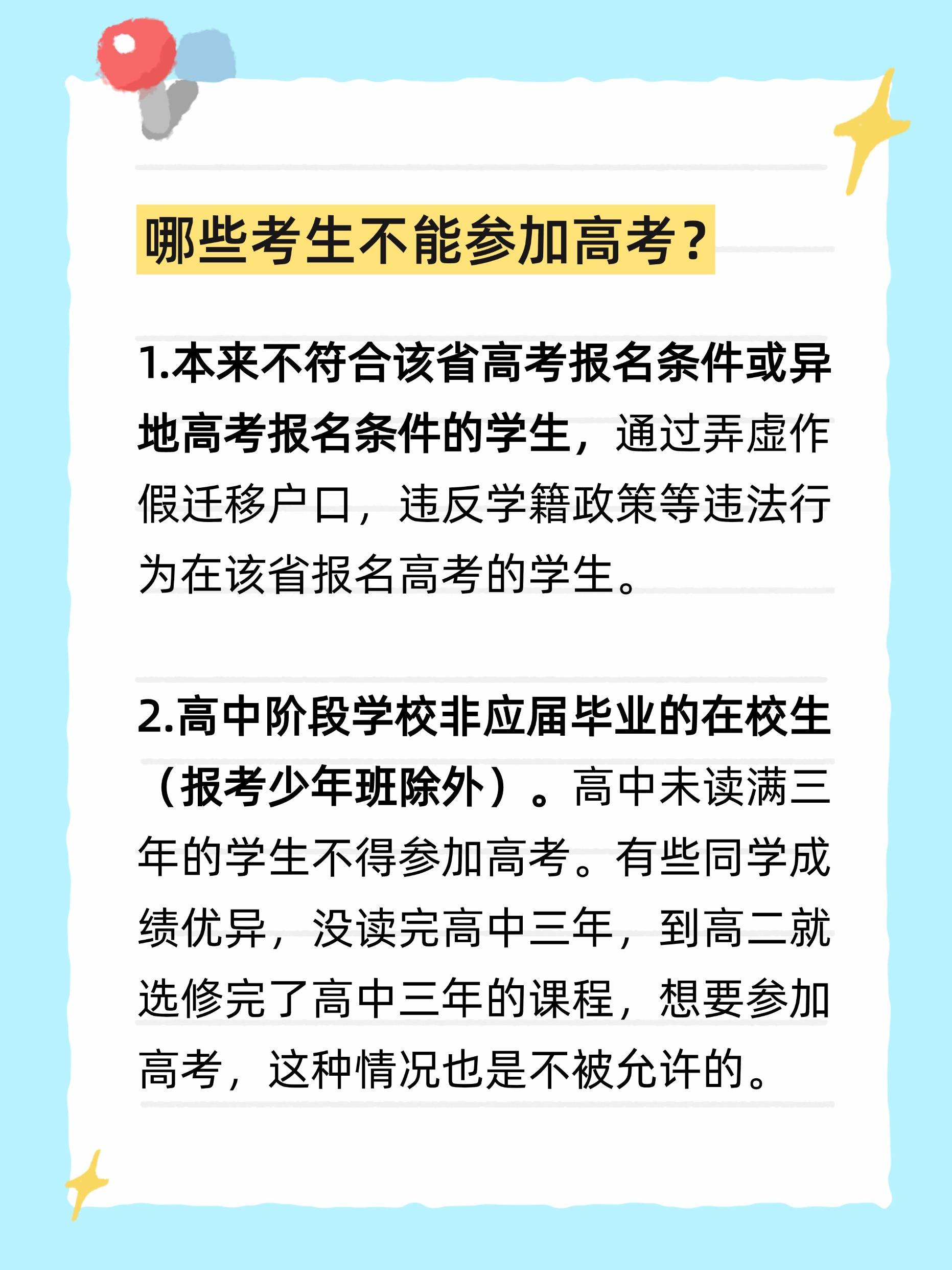 哪些考生不能参加高考? 违规报考者:通过虚假迁移户口、伪造学籍等不正当手段获取该省高考报名资格的学生。 非应届在校生:高中未毕业的在校生(报考少年班除外),即使提前修完课程也不允许参加高考。 已有高校学籍者:已被大学录取并注册学籍的考生(须先办理退学取消学籍方可报考)。