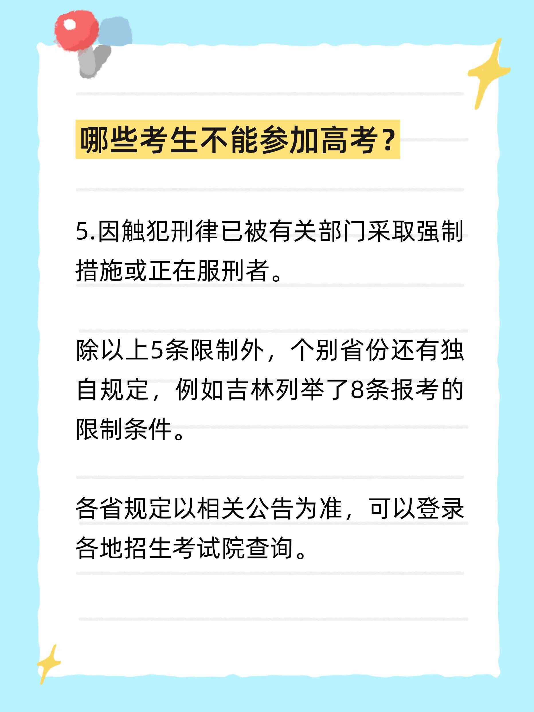 处于停考期人员:因违反考试规定被暂停高考资格且在处罚期内的人员。 触犯刑律者:因触犯刑法被采取强制措施或正在服刑的人员。 除以上5条限制外,个别省份还有独自规定,例如吉林列举了8条报考的限制条件。各省规定以相关公告为准,可以登录各地招生考试院查询。