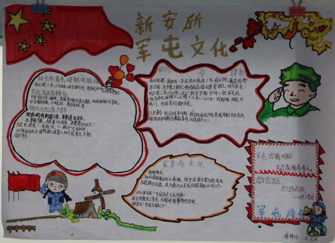 作为历史悠久的文化古镇,新安所的“军屯文化”是刻在骨子里的核心标识。展示环节中,各班级化身“军屯文化探寻者”,用图文并茂的手抄报勾勒历史脉络,以生动的故事分享解读文化内涵,让尘封的军屯记忆重新鲜活。