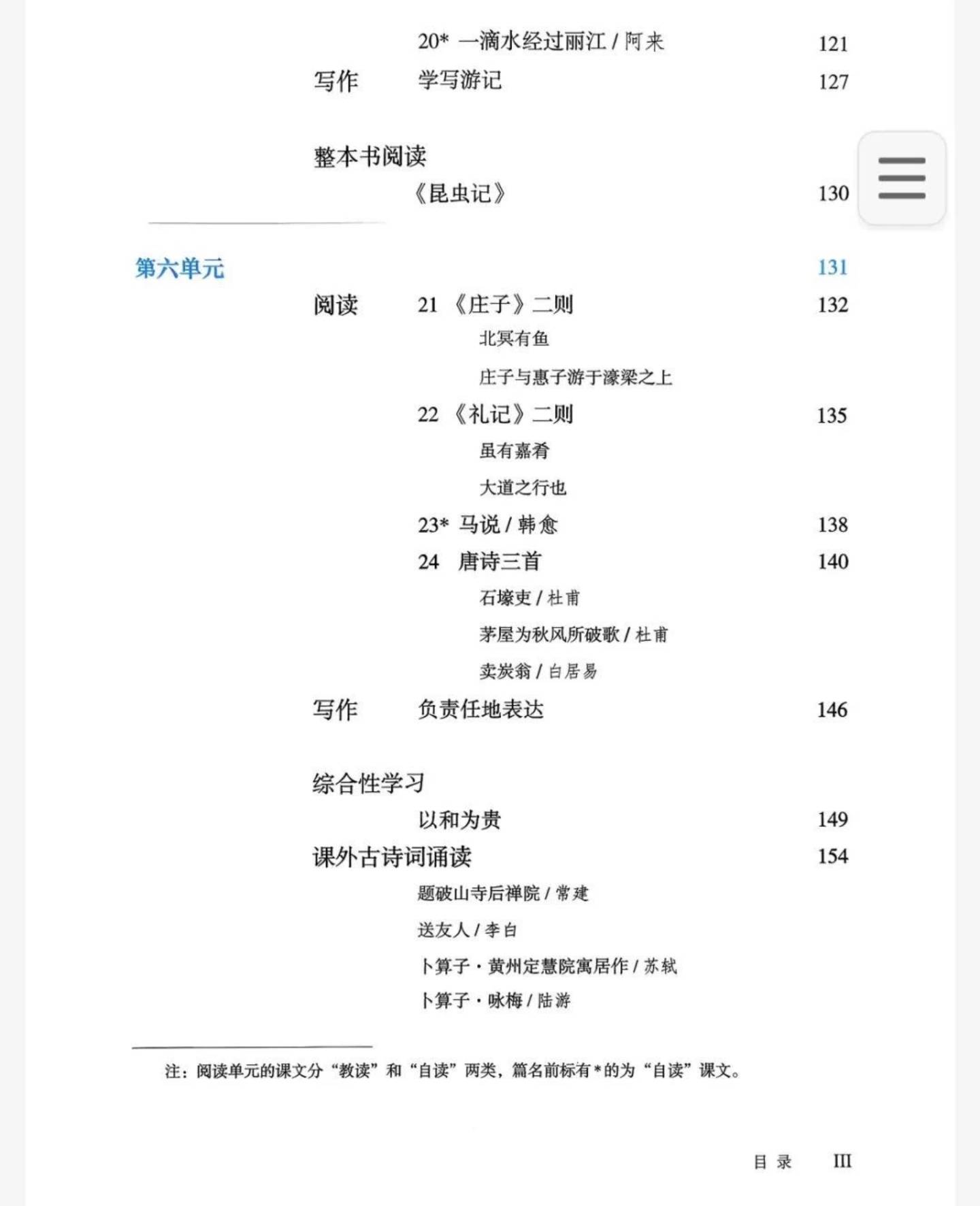 今天为大家分享:2026春新版人教版八年级下册语文电子课本PDF高清版。从内容构成看,它包含单元导语、课文阅读、写作指导、整本书阅读、课外古诗词诵读、综合性学习等板块。课文涉及不同体裁,如鲁迅的小说《社戏》,陶渊明的古文《桃花源记》,梁衡的散文《壶口瀑布》,还有演讲词、科普文等;古文涵盖《诗经》二首、《庄子》二则、《礼记》二则等经典篇目;写作部分有学写读后感、游记、负责任地表达等训练;整本书阅读涉及《经典常谈》《昆虫记》;课外古诗词诵读包含多首经典诗词;综合性学习有 “以和为贵” 等主题。