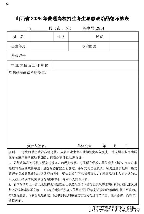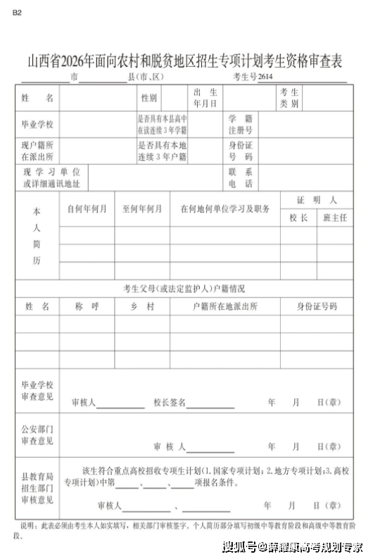 具有上述报名条件的考生,由本人在规定时间内到户籍所在县(区)招生办提出申请,并如实填写《山西省2026年面向农村和脱贫地区招生专项计划考生资格审查表》(网上下载),经所在县教育、公安部门审核合格后,方可报考面向脱贫地区招生专项计划志愿。逾期不予受理。