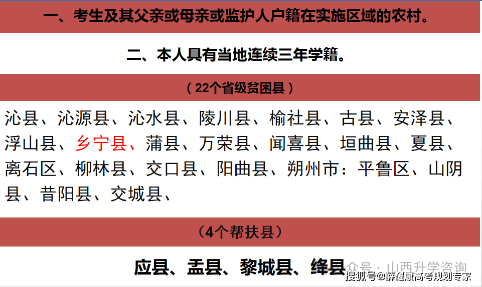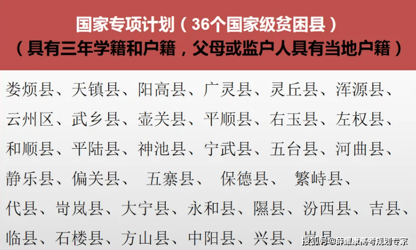 1、国家专项计划:报考国家专项计划的考生须同时具备下列三项条件:(1)符合2025年普通高考报名条件;(2)本人具有实施区域(36个县(区))当地连续3年以上户籍,其父亲或母亲或法定监护人具有当地户籍;(3)本人具有户籍所在县高中连续3年学籍并实际就读。