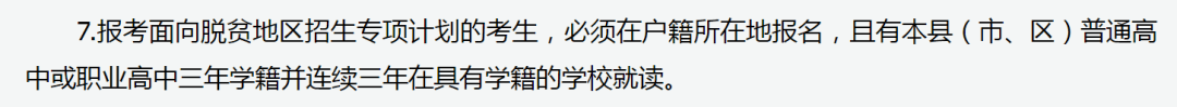 2、地方专项计划:报考地方专项计划的考生须同时具备下列三项条件:(1)符合2025年普通高考报名条件;(2)本人及父亲或母亲或法定监护人户籍地在实施区域(22个县(区)和4个省乡村振兴重点帮扶县)的农村,本人具有当地连续3年以上户籍;(3)本人具有户籍所在县高中连续3年学籍并实际就读。
