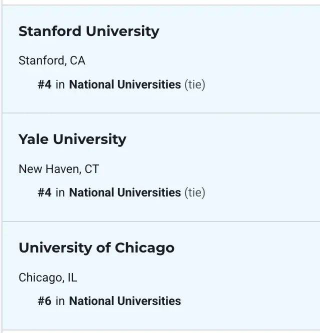 斯坦福和耶鲁并列第4,芝加哥大学跌至第6,而杜克、约翰斯·霍普金斯、西北和宾大并列第7,格局趋向胶着。