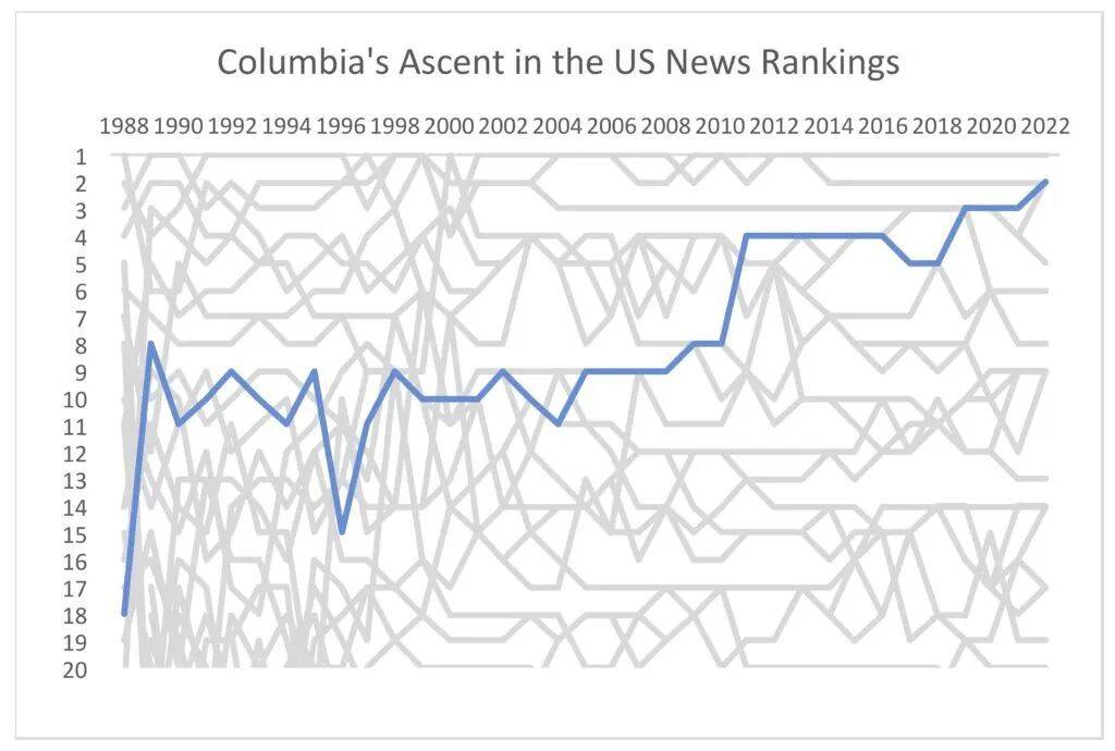 哥伦比亚大学在U.S. News排名中的上升轨迹(1988–2022)。2021年达到历史最高第2位,但随后的数据丑闻引发巨大争议。