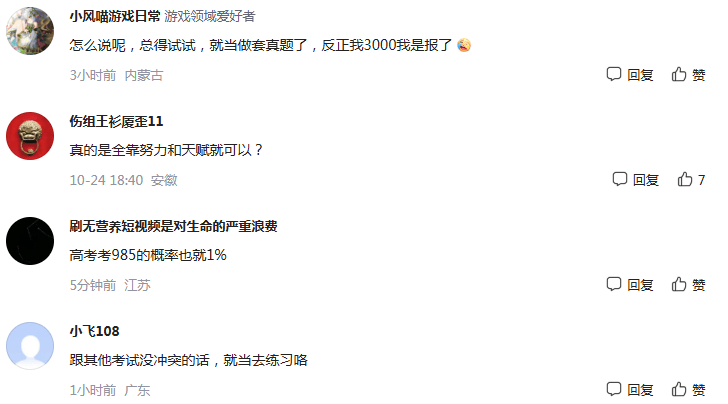 有人开玩笑:“真等你考上公示了,我们集体去举报,举报你考前摸鱼幻想!” 也有路人觉得纳闷:“人家畅想一下咋了,又不犯法?”