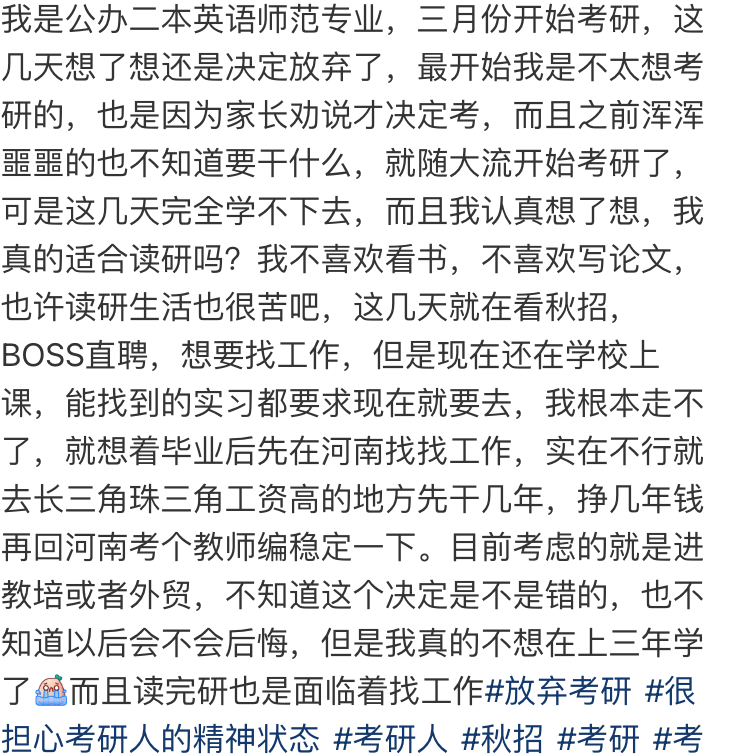 有的人很喜欢读书,享受坐在象牙塔里的生活,但也有人厌恶读书,所以会在报名之际纠结后放弃报考。