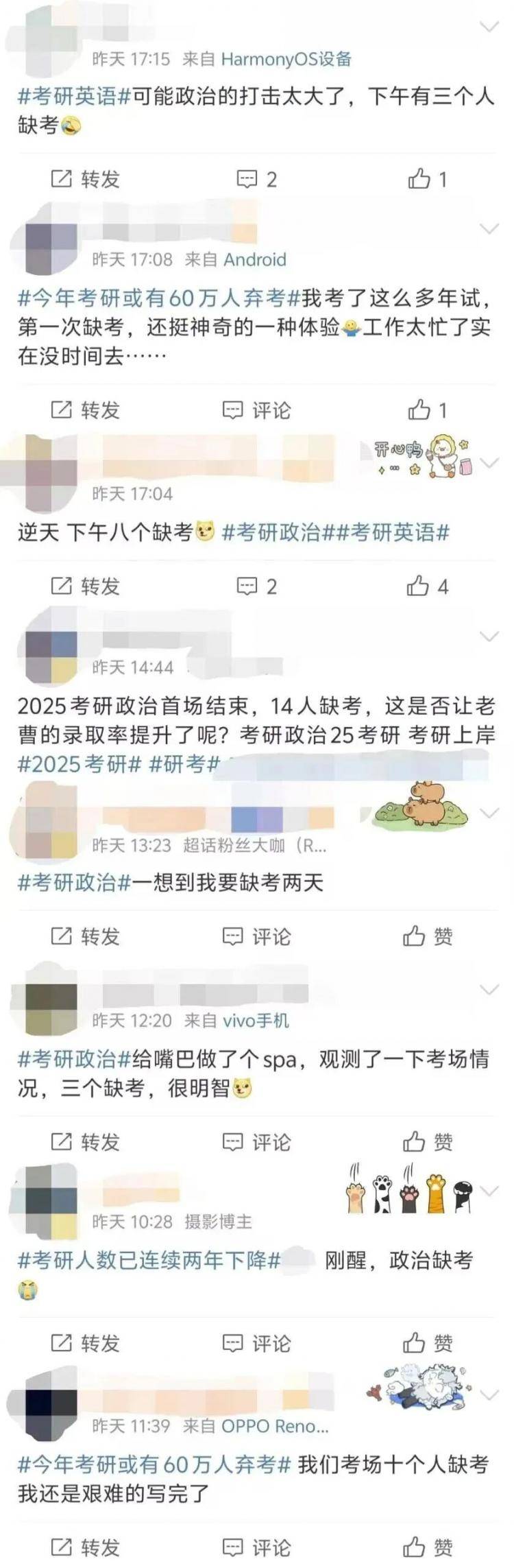 加之考研热度近两年的确在下跌,弃考的人在增加,25考研弃考人数估计有60万甚至到80万左右的考生弃考。
