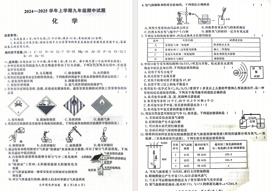 24-25郑州九校联考期中化学试卷及答案
