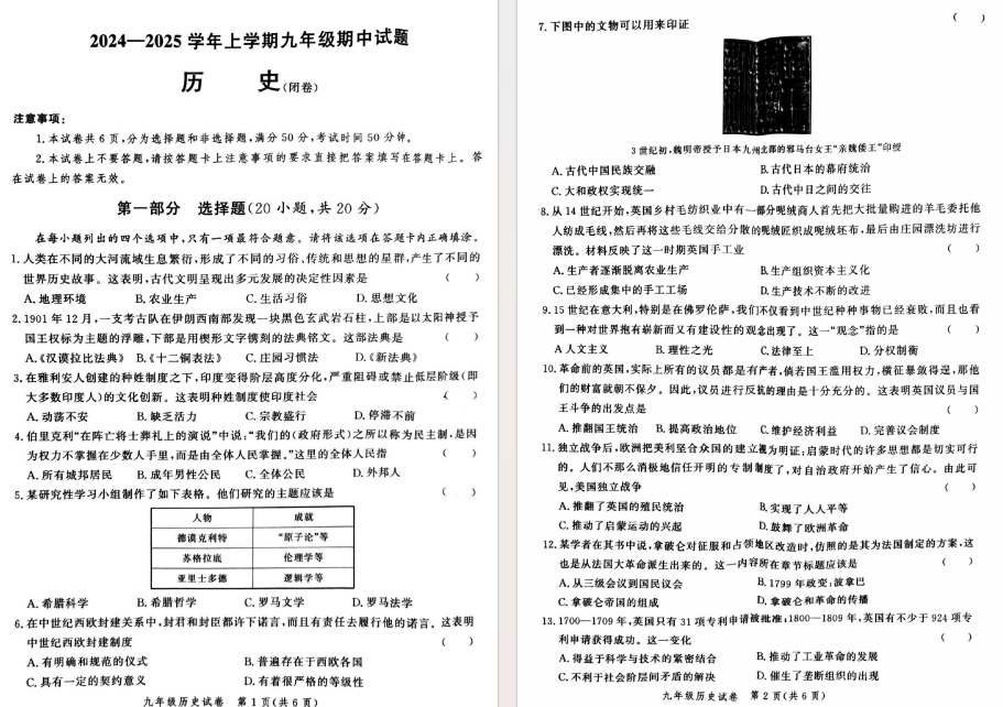 24-25郑州九校联考期中历史试卷及答案
