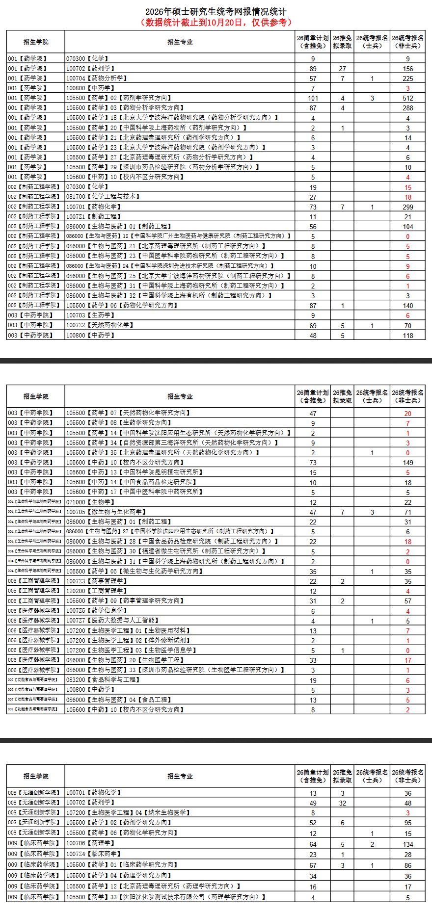 截止10月20日,沈阳药科大学2026年研考共报名3117人;学校2026年硕士研究生计划招生1662人,其中推免已招收123人;