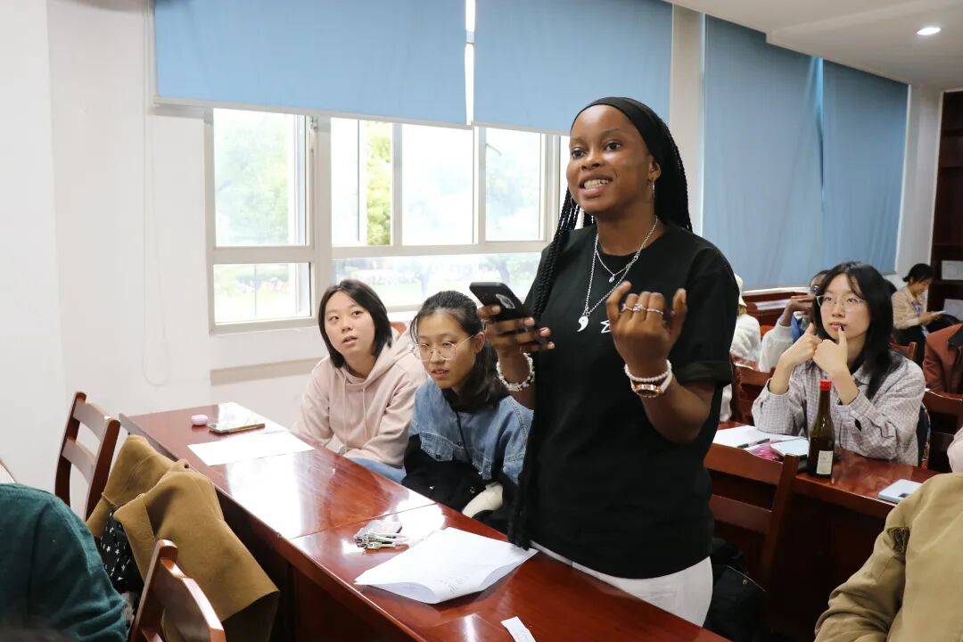 活动伊始,指导老师吴哲珺介绍了双语读书会的创办初衷,并引出本次讨论主题。活动分为《木兰辞》双语文本朗读、故事新编、“木兰情境下你的选择”讨论及“我敬佩的女性”故事分享四个环节。三位学生主持人徐祯妮、林心雅、周蜒慧以流利的英语轮流主持,中外学生三两结对交流,现场氛围热烈。其中,白族学生张婉渟讲述的女英雄白洁夫人故事,以及尼日利亚学生明月、明玉分享的阿米娜女王事迹尤其令人印象深刻;双语交叉朗读的形式让“花木兰”这一经典女性形象与故事在跨文化对话中焕发新彩。