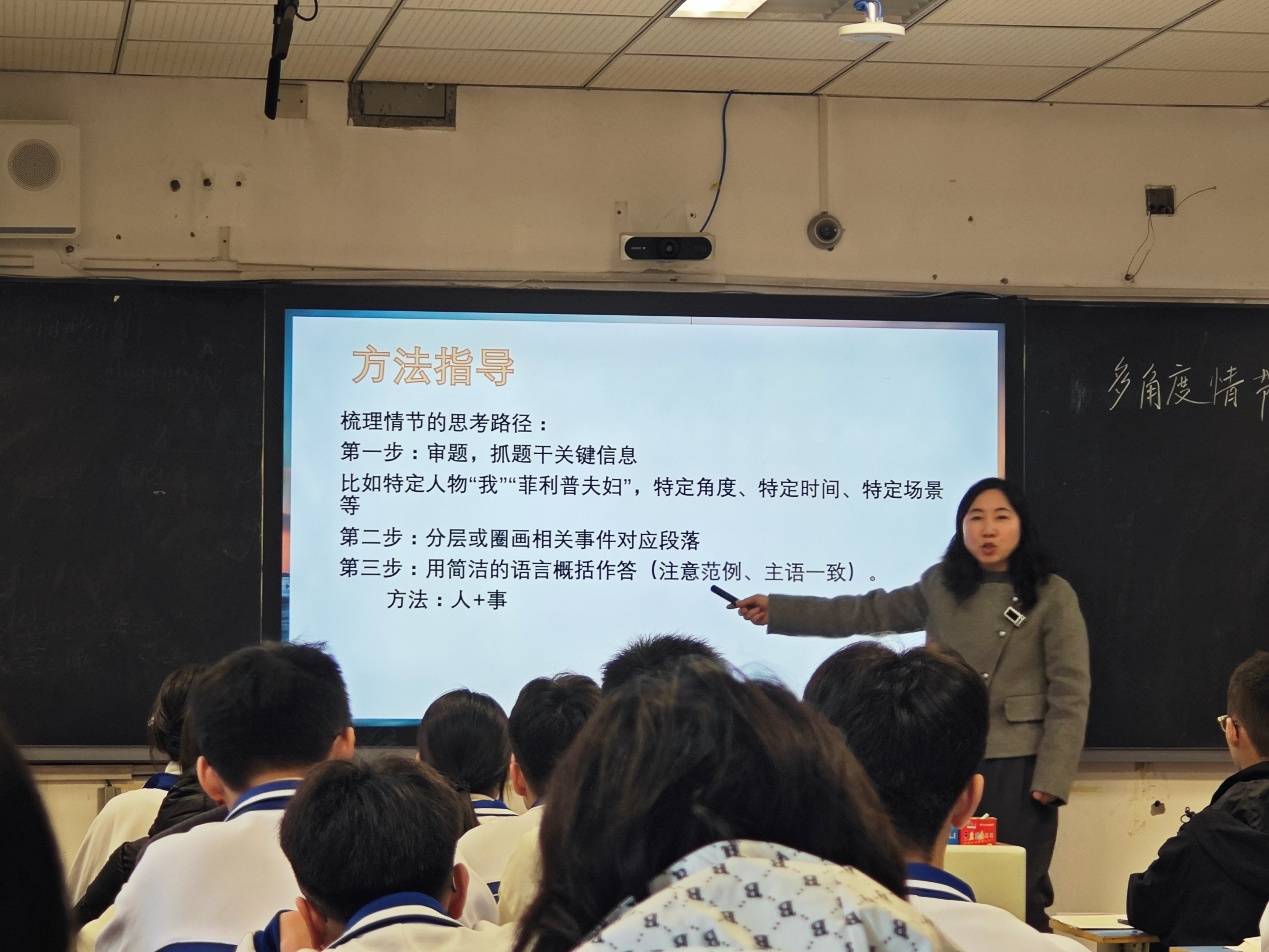 两节课后,评课研讨会随即召开。七年级教师代表指出,课堂以“任务驱动”激活学生主动性,从文本梳理到方法提炼的过渡自然流畅,为低年级小说教学提供了借鉴;八年级教师代表认为,“多角度”梳理的引导精准到位,既覆盖莫泊桑小说“情理之中、意料之外”的艺术特色,又紧扣学情突破难点;九年级教师代表强调,中考方法总结与真题应用的设计直击备考痛点,“评检”环节的即时反馈有效提升课堂效率。