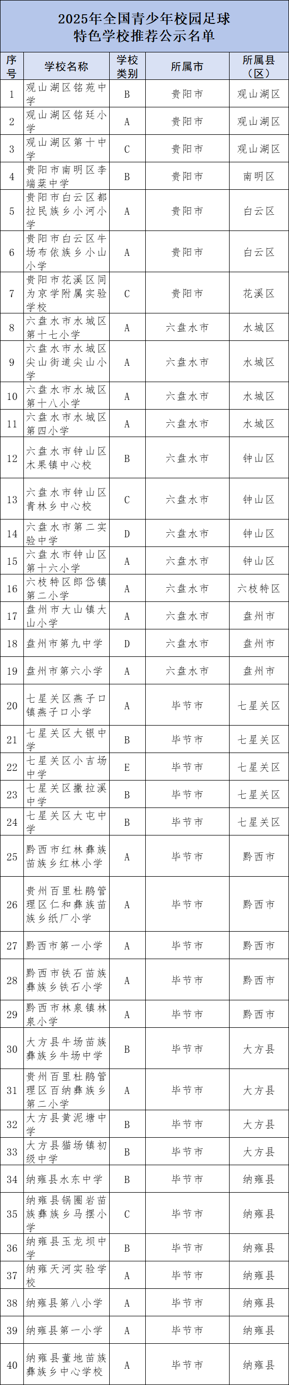 根据教育部体育卫生与艺术教育司《关于开展2025年度全国青少年校园足球特色学校申报工作的预通知》,经各校自主申报,各级教育行政部门逐级审核,省教育厅拟推荐贵阳市观山湖区铭苑中学等80所学校申报全国青少年校园足球特色学校,现将名单予以公示,一起来看——