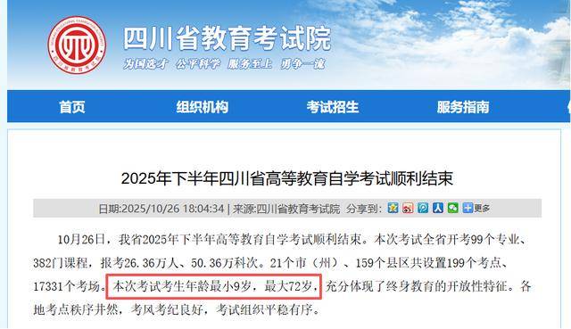 10月26日,四川省教育考试院官网发布公告,2025年下半年四川省高等教育自学考试顺利结束。本次考试全省开考99个专业、382门课程,报考26.36万人、50.36万科次。21个市(州)、159个县区共设置199个考点、17331个考场。本次考试考生年龄最小9岁,最大72岁。