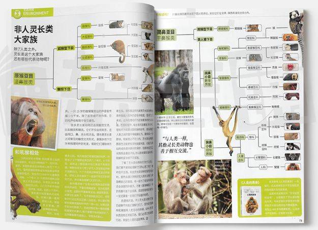 2、再读点能长见识的科普书很多数学题的背景藏在科普里,比如“算火箭发射的时间”“算鱼塘里水的体积”,要是孩子连“火箭怎么飞”“鱼塘是什么”都不知道,读题时就容易一头雾水。如果孩子从小多看看各类科普杂志,增长见识,思维也会随之打开。例如《好奇号》,涵盖科普、艺术、历史、人文等多个领域的百科全书,满足孩子的好奇心,又能开拓眼界,丰富孩子的科学思维。点击图片,可订阅《好奇号》《万物》杂志则更直观,图文并茂,生动形象图片和图表更好理解,比如“非人灵长类大家族的分部”,孩子看的时候,既能了解新鲜事,又能慢慢习得“从文字和图表里找信息”—— 这跟做数学情境题要“找条件”,其实是一回事。