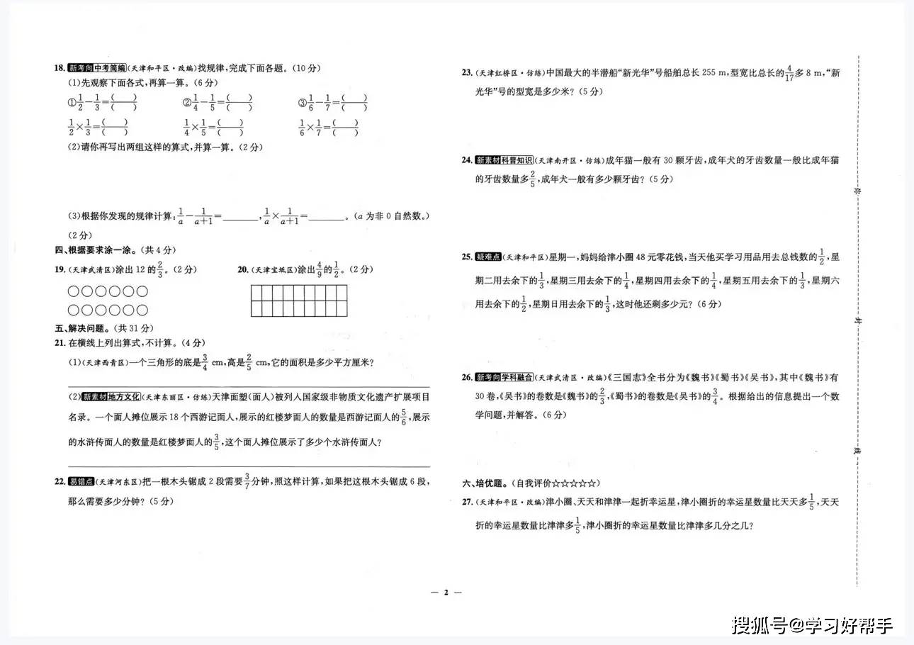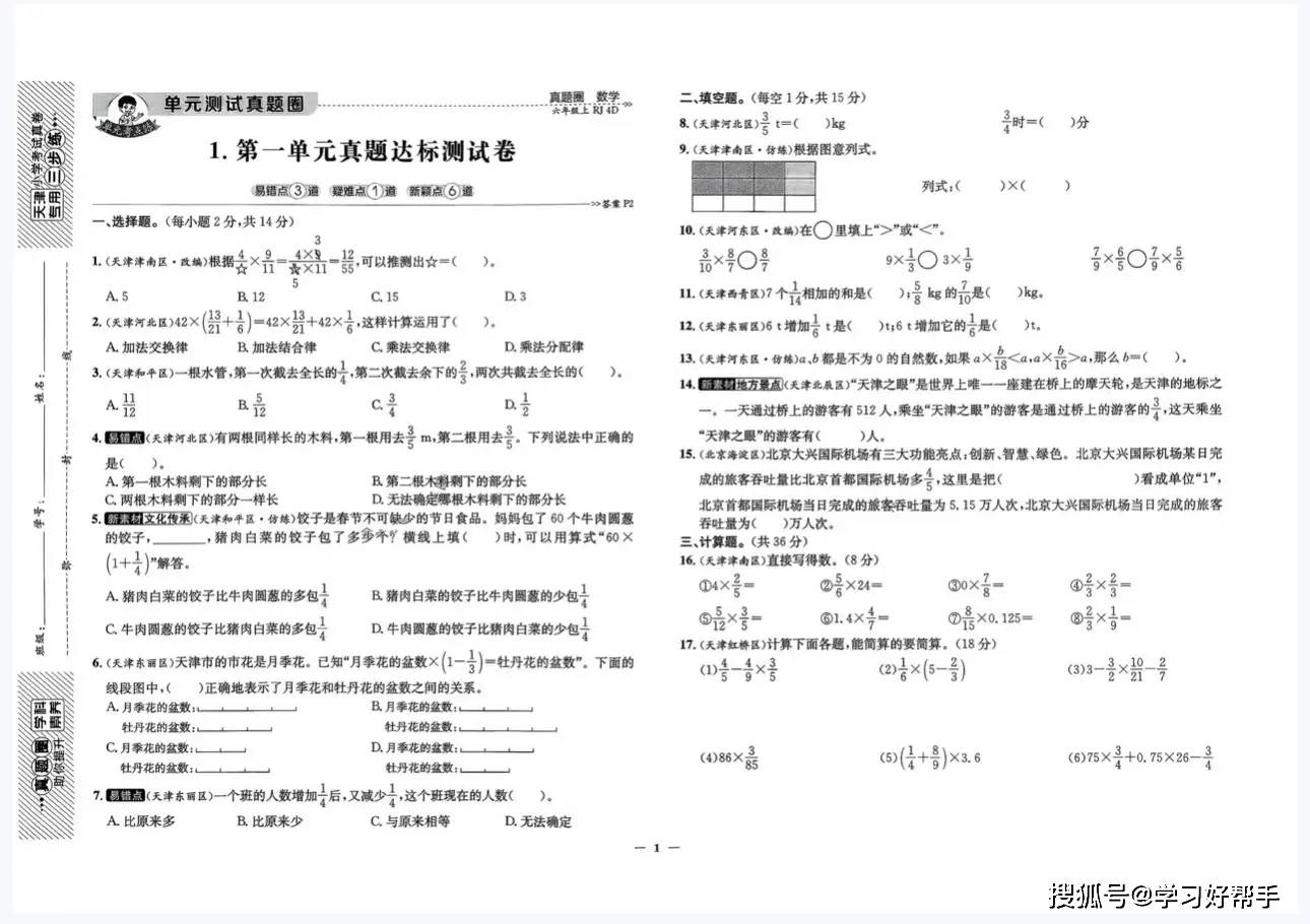 它的核心亮点真的太戳心了!首先是专版适配超精准,不搞泛泛的全国题,只精选天津各区名校历年真题,像分数乘法、圆的周长与面积、百分数的应用、比和比的应用这些六上高频考点全覆盖,本地考什么就练什么,靶向刷题比盲目刷外地题管用多了,避免孩子做无用功。