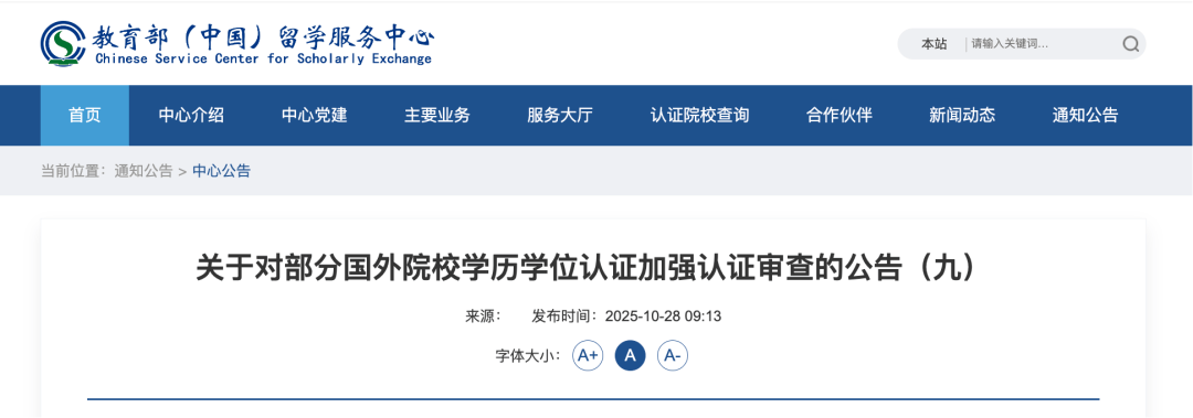10月28日,教育部留学服务中心发布《关于对部分国外院校学历学位认证加强认证审查的公告(九)》,决定对4所海外院校的相关认证申请启动加强审查程序。