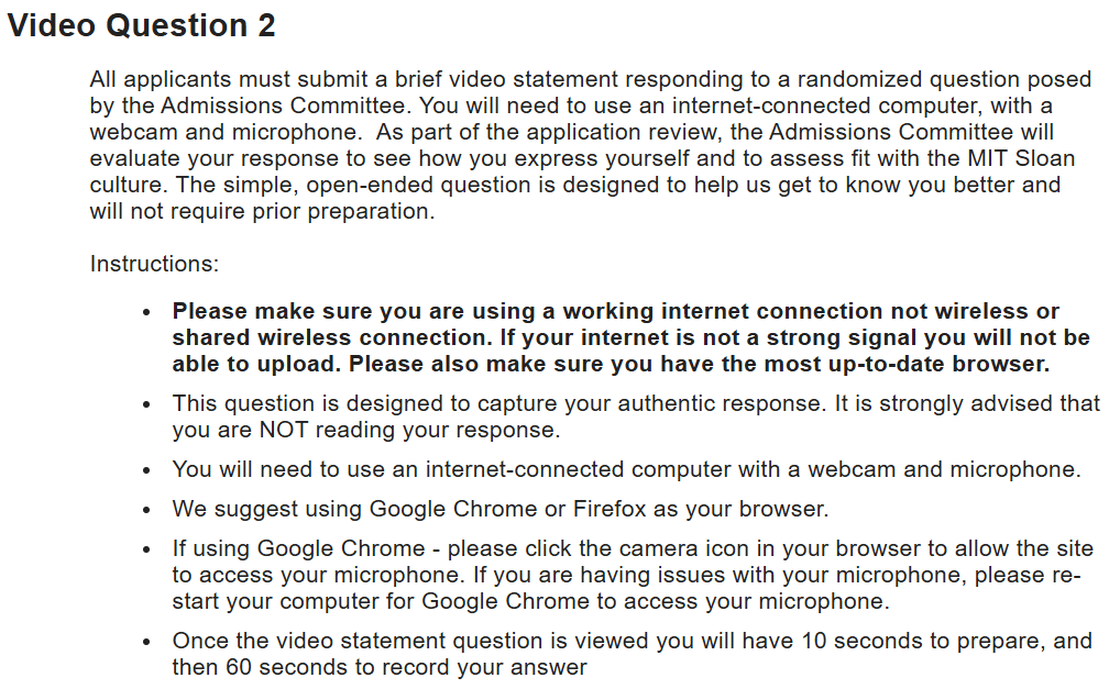 面试一般分为机器面试和面试官面试两种,MIT Mfin的video question是在提交申请阶段就需要录制的,根据文书及video录制的结果,综合筛选后发放人工面试的机会。