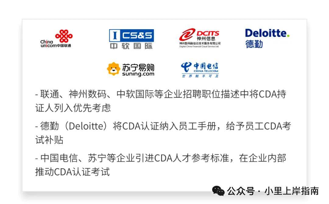 ? 从表中可见,CDA证书在薪资和就业机会上优势明显。中国联通、央视广信、德勤、苏宁等企业,都把CDA持证人列入优先考虑范围,甚至为员工的CDA考试提供补贴。