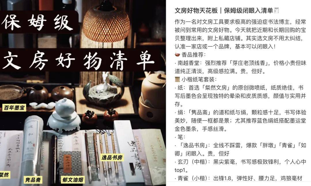 他的视频里,一半是日常练字、一半是逛文房店的生活场景,看起来像是单纯分享爱好,实则藏着不少广告痕迹:有时会自然地展示“最近在用的某品牌毛笔”,有时会提一句“这款墨汁写出来不洇纸”,甚至会拍一期“文房好物开箱”—— 这些看似随意的分享,其实也暗藏着不少品牌合作。