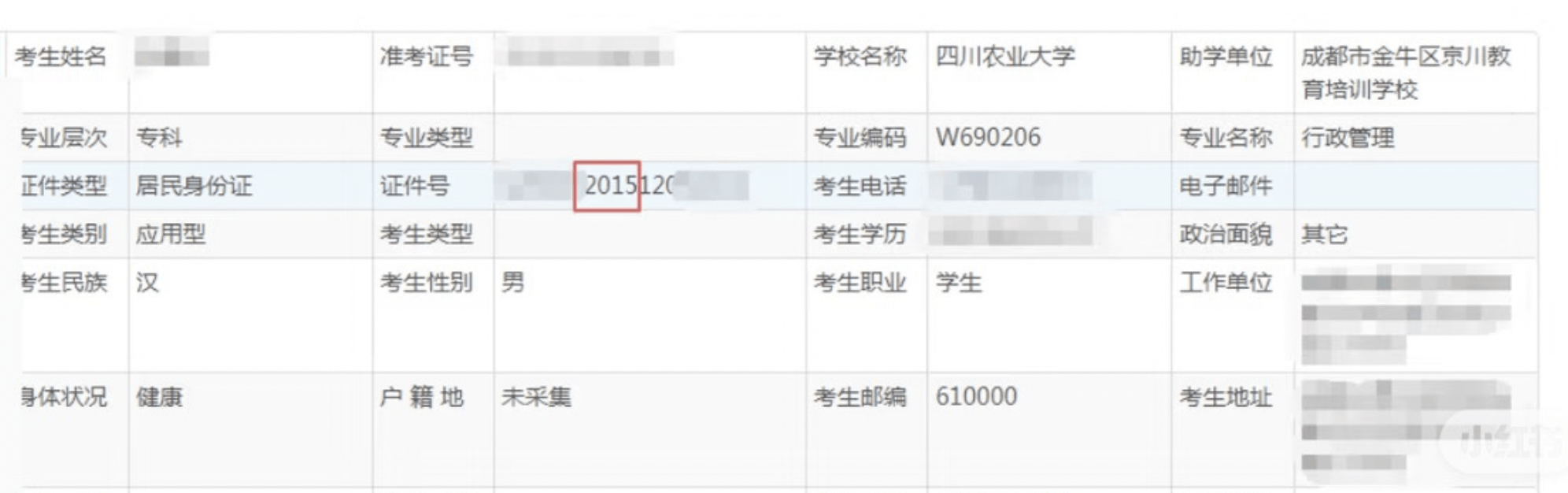 有网友自称是9岁考生的招考老师,2015年12月出生,报考的是四川农业大学,助学单位是成都市金牛区京川教育培训学校,专业层次是专科,专业名称是行政管理,潇湘晨报记者私信这名网友,得到回复,为保护同学的个人信息,不便透露。