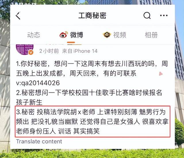 10月29日,重庆工商大学的一相关校园账号“工商秘密”上出现一则指控,称法学院胡x老师“上课特别刻薄、把没礼貌当幽默”。这条模糊指代的匿名投稿在微信群聊中迅速传播,引发关注。