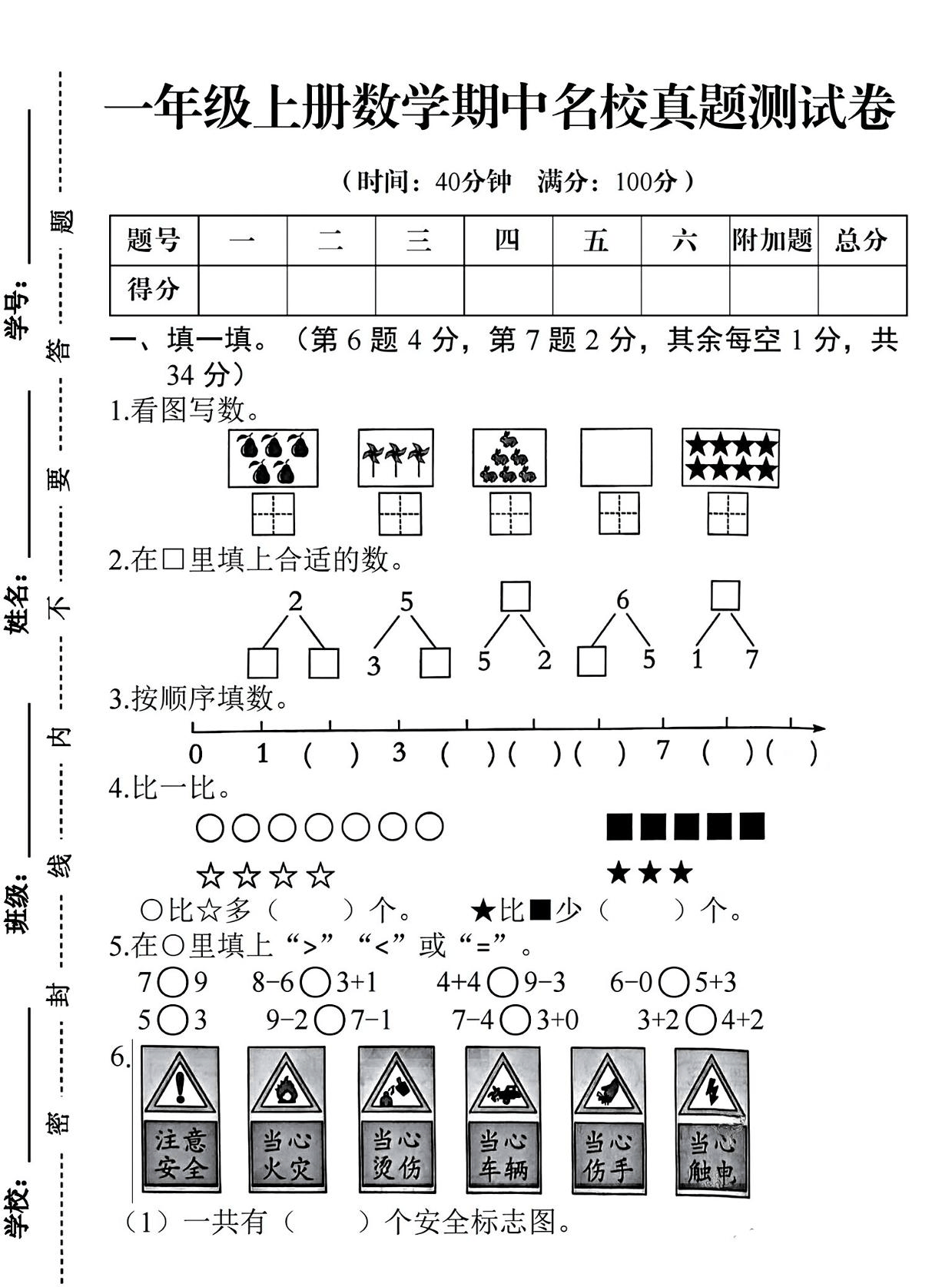 各位家长好!期中临近,给孩子们准备一套优质真题卷太关键啦~ 今天给大家推荐这份一年级上册数学期中名校真题测试卷,都是精选多所重点小学的期中真题汇编。