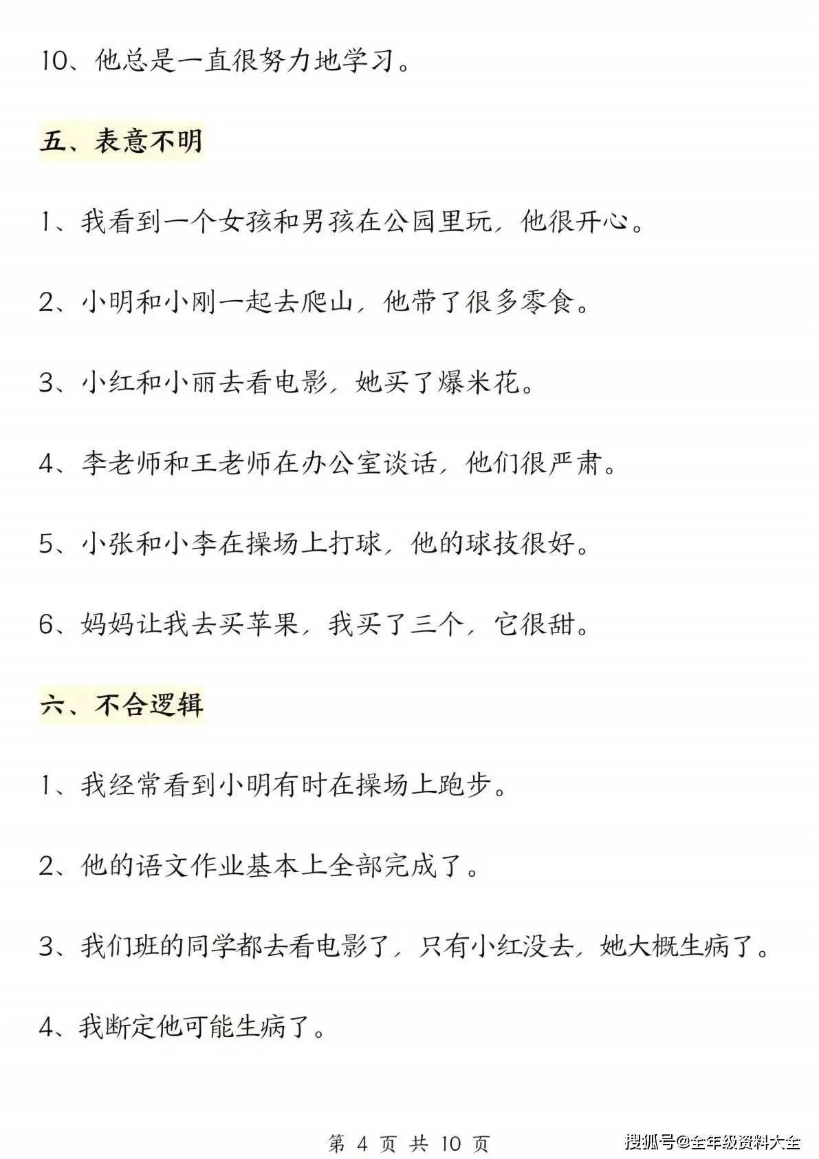 更贴心的是,练习设计兼顾 “实操性与便利性”:20 页内容包含丰富的专项练习题,每个病句类型都搭配足量例题与变式练习,让学生在反复实操中熟练掌握修改方法(如调整词语搭配、理顺语序、补充缺失成分、删除重复语义等);同时配套完整答案,每道题都清晰标注病因与修改思路(如 “病因:搭配不当,‘提高’与‘错误’不搭配,修改为‘改正错误’”),学生做完后能自主核对、查漏补缺,家长辅导时也能轻松参考,避免 “改不对、讲不清” 的困扰。