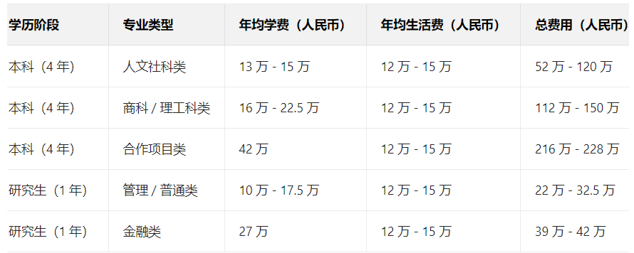 1. 本科课程:年均 13 万 - 42 万人民币,热门专业占比高