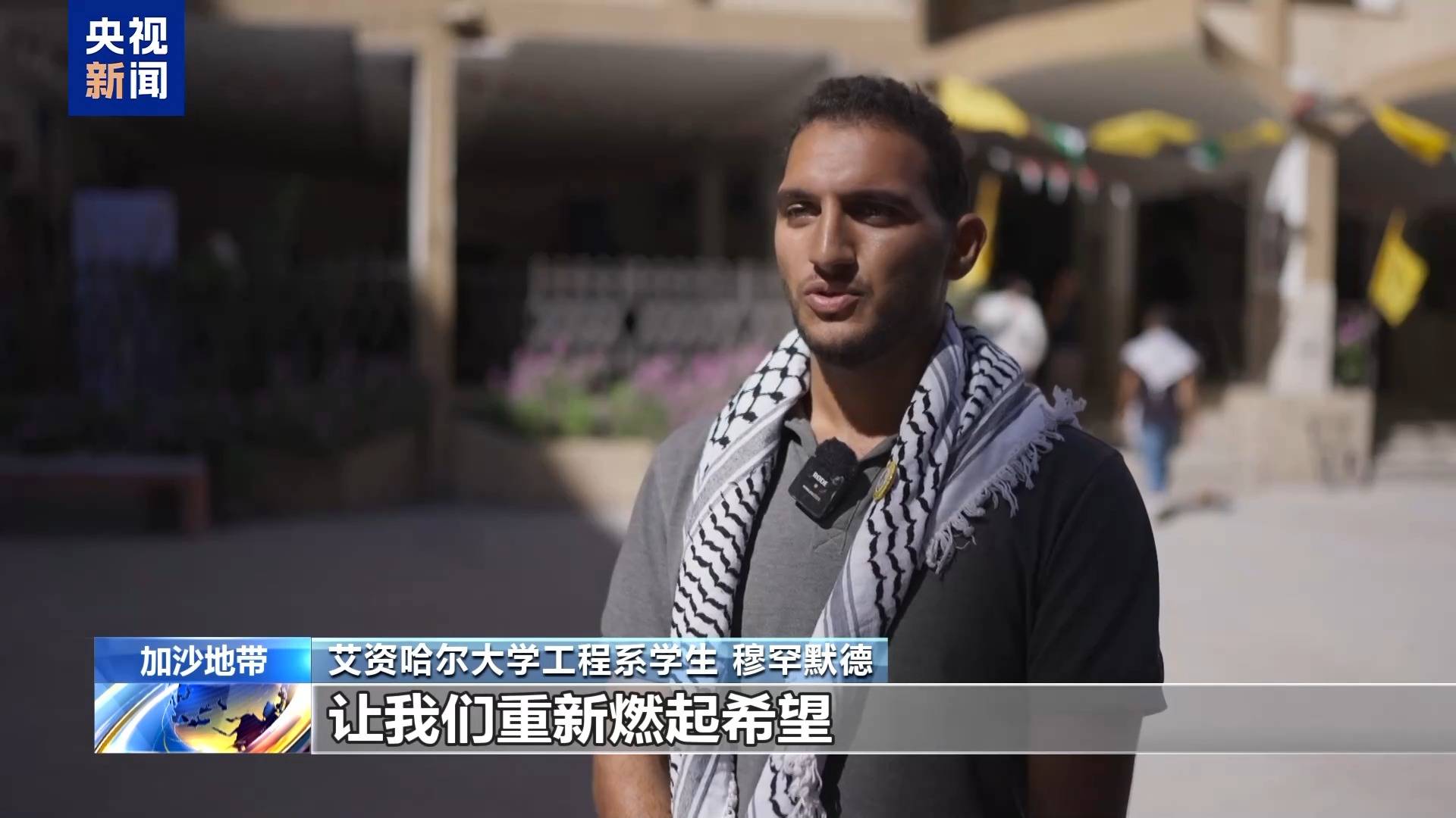总台报道员 奥萨马:我现在所在的位置是加沙地带的艾资哈尔大学。经历了两年的战争后,这里首次重新向新生开放校门,为新学年做准备。虽然校园在以色列军队的轰炸中遭受严重破坏,教学物资依然短缺,而且由于大量居民流离失所,这里一度被改作避难中心,但令人欣慰的是,人们仍然重视教育。