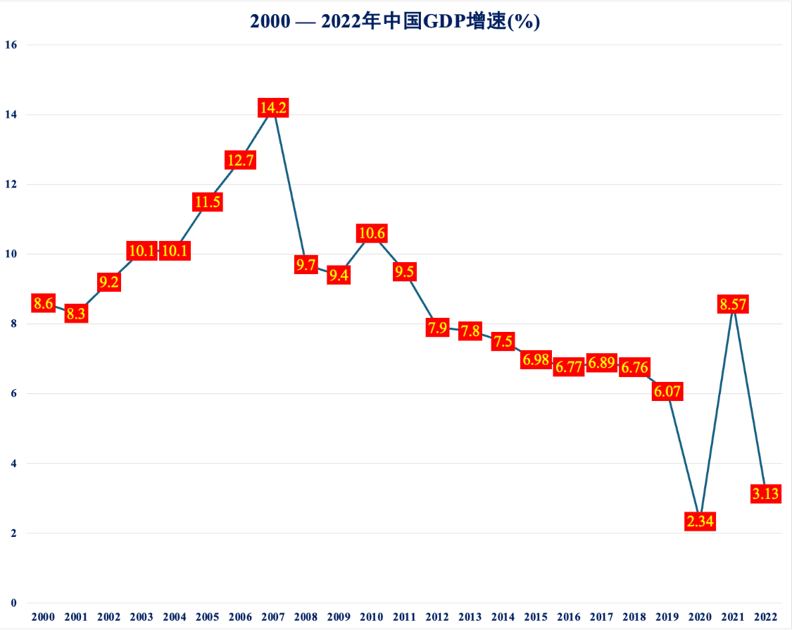 根据国家统计局的数据,从2000年到2022年的GDP增速如下:
