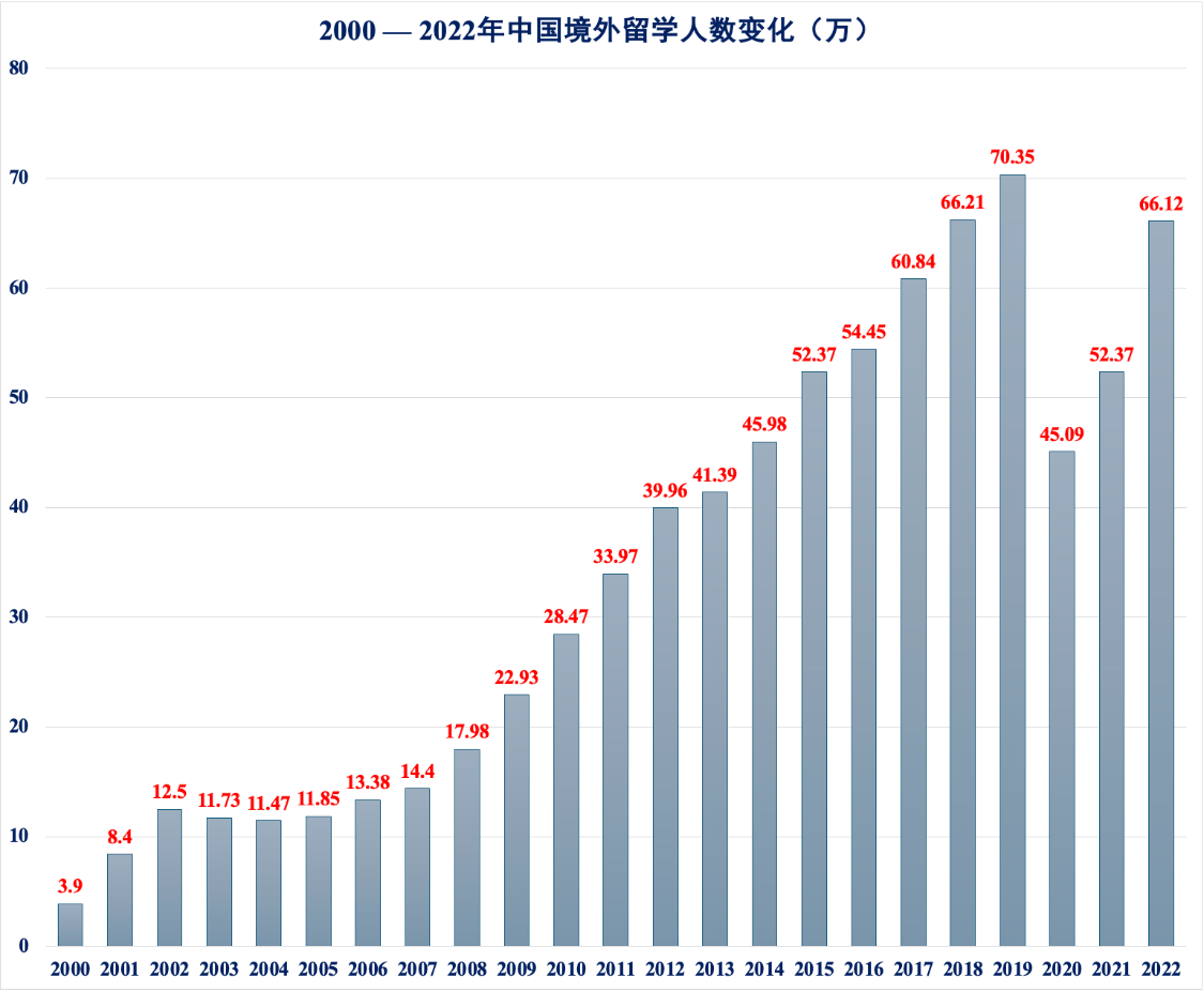 我统计、汇总了从2000年到2022年中国教育部、全球化智库公布的中国境外留学人数,其中: